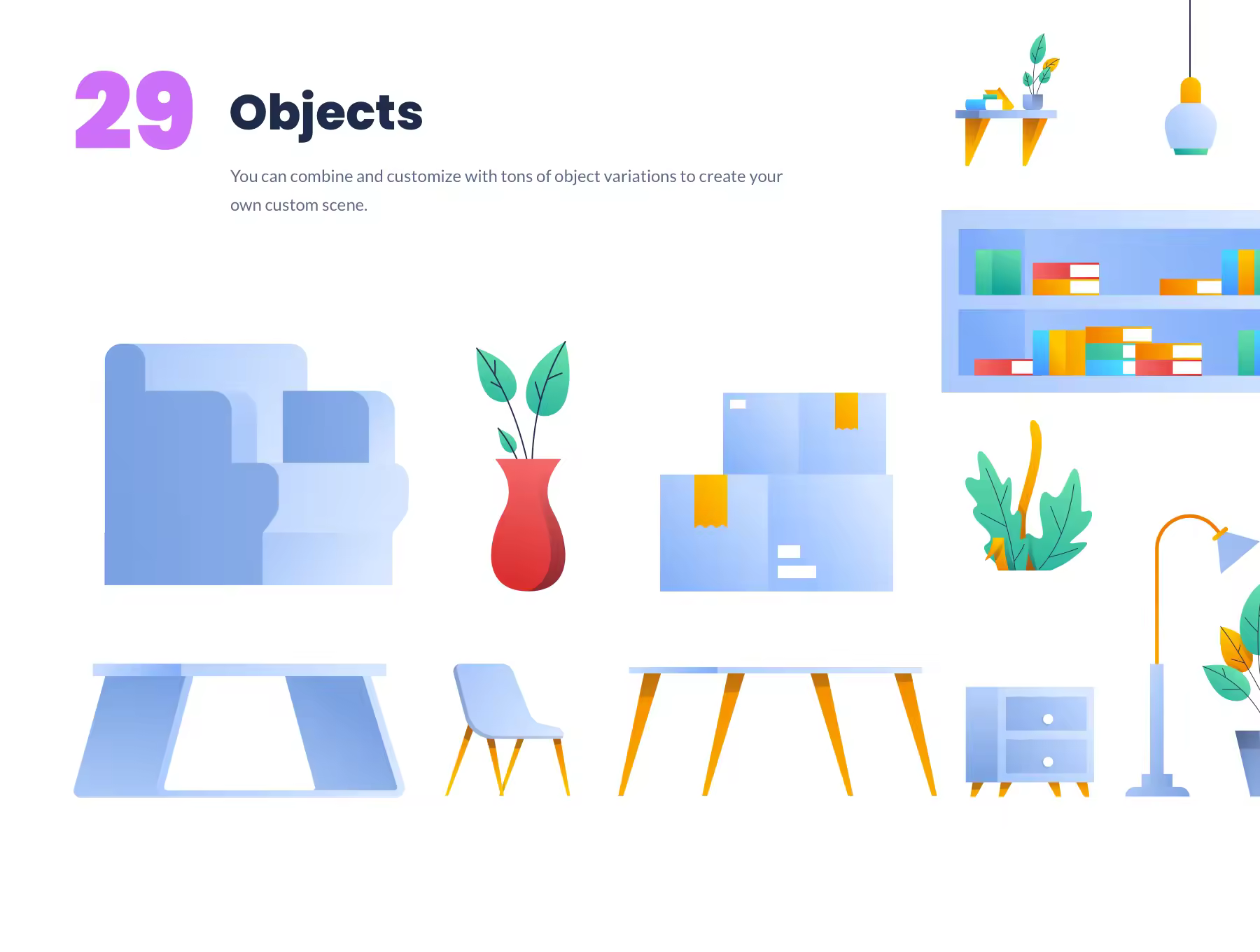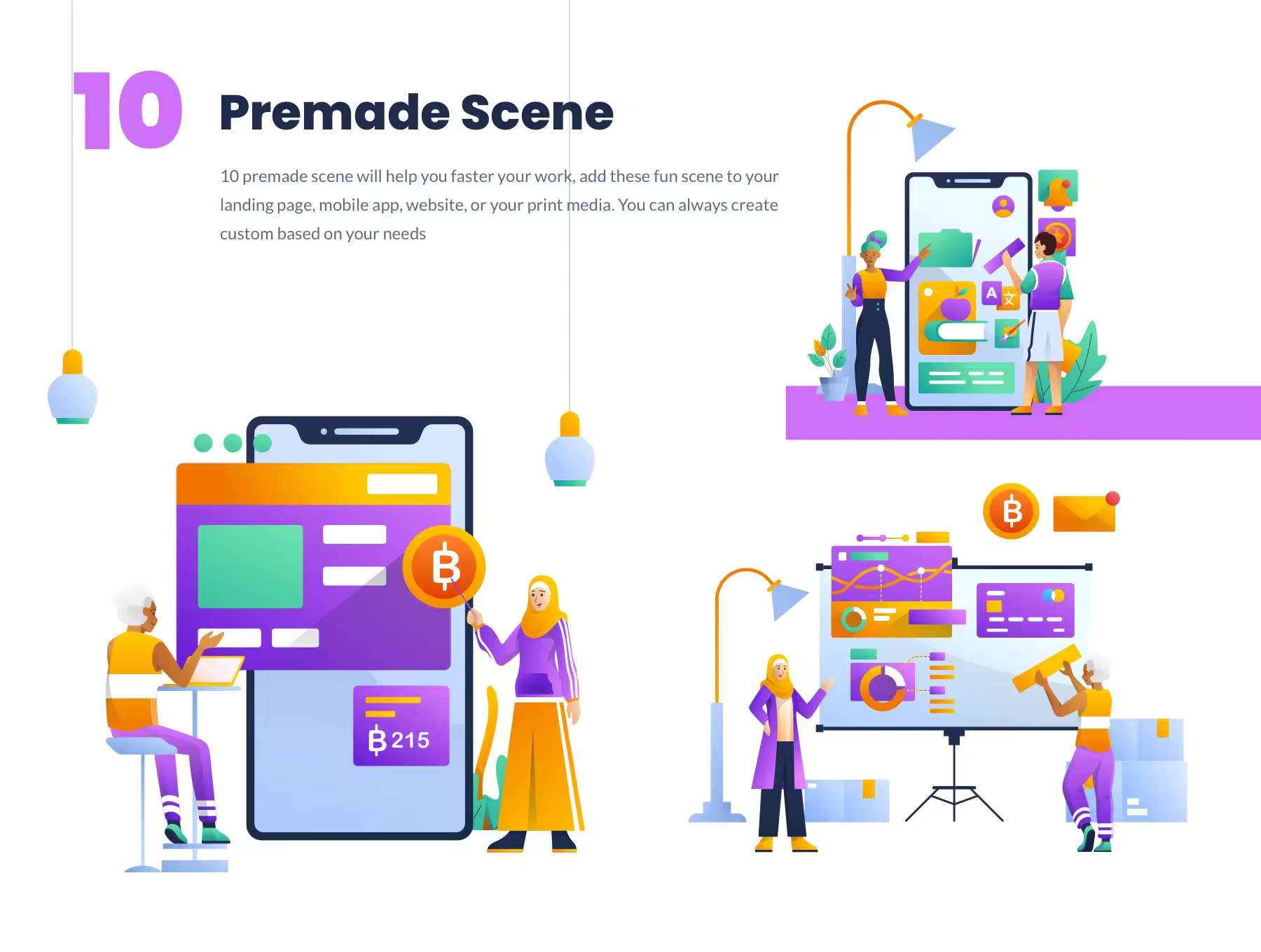 带有各种角色,辅助背景和预制场景,可进行大量组合。这是为设计师,开发人员,设计机构,初创公司创建的,旨在加快项目进度并提供高质量的场景插画。