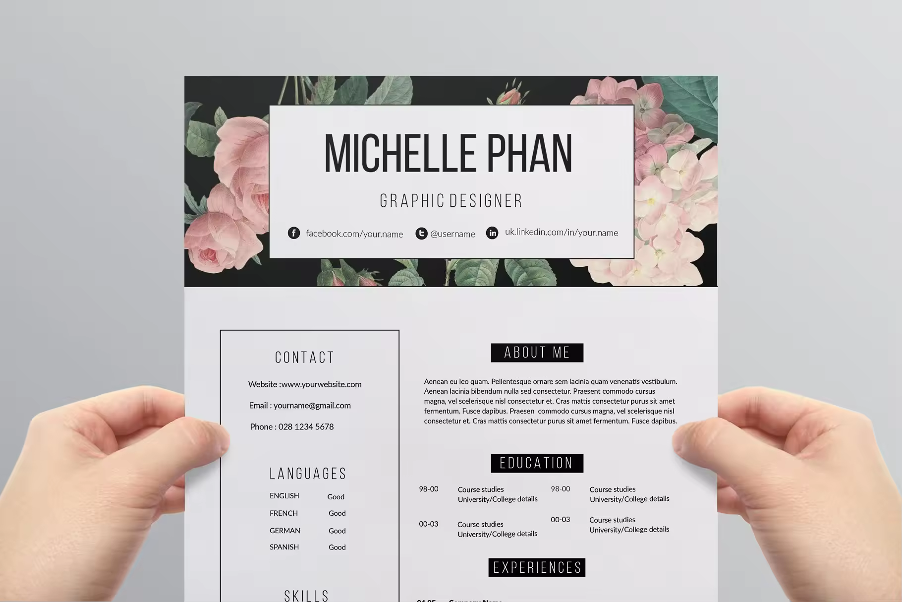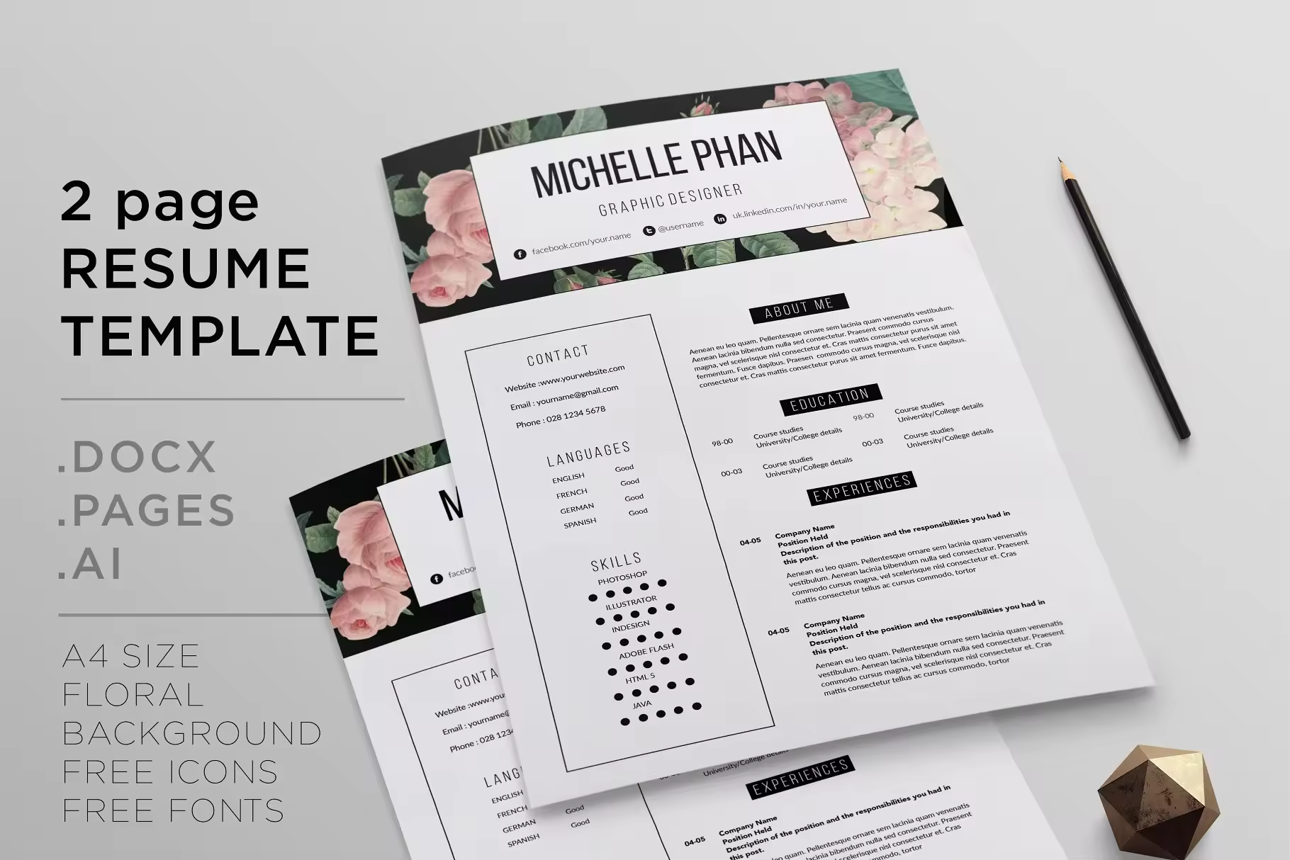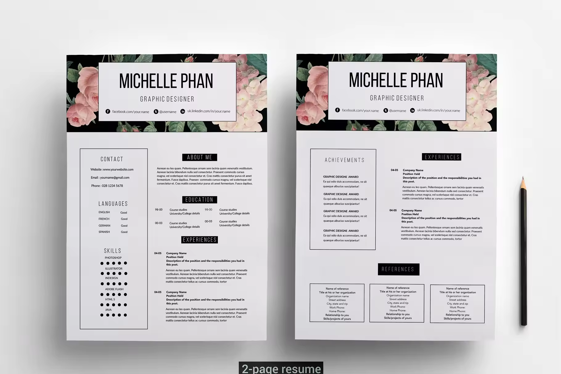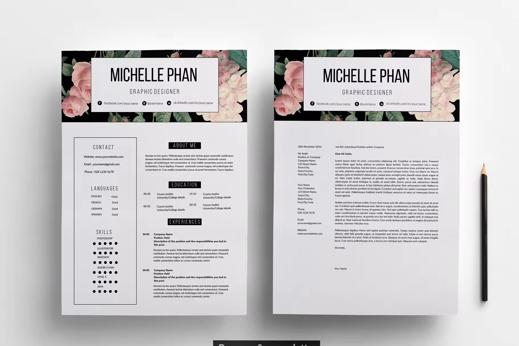 这个超级别致,简洁和现代的简历将帮助您得到面试官的注意!这组合集包括了一个两页的简历模板,一个漂亮的花卉主题的求职信模板。