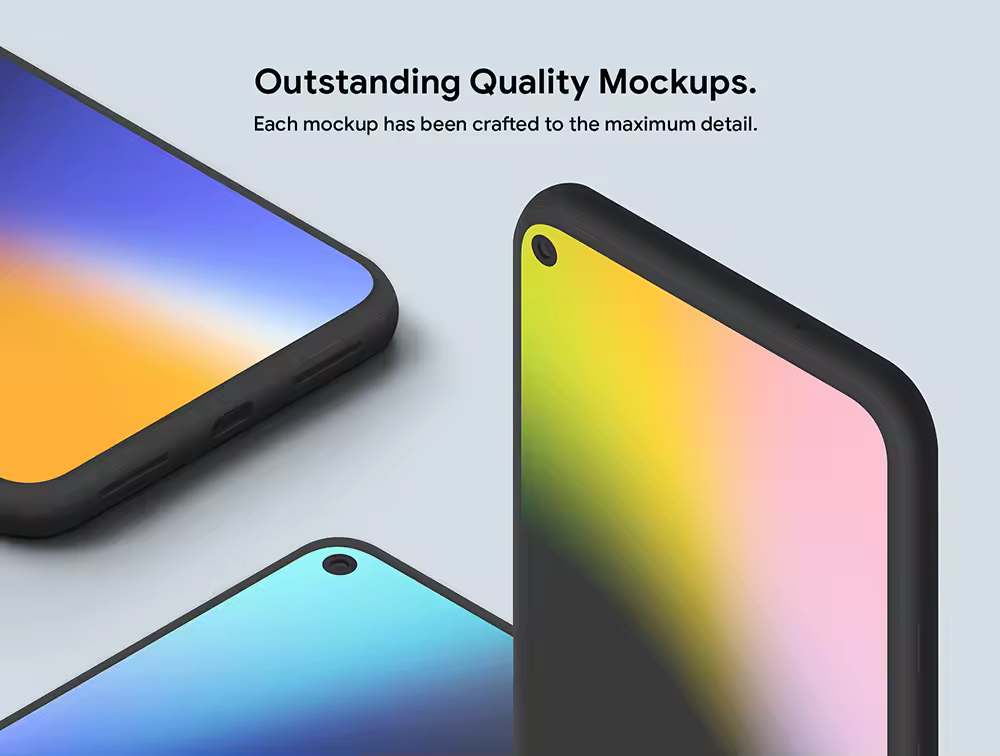 适用于Photoshop的15个Google Pixel 5粘土样机的完整集合。每个PSD样机都是完全可自定义的颜色,每个PSD样机内部都有2个不同的阴影(地板阴影和浮动阴影),每个PSD样机都组织得很好并且易于使用,可自定义的背景。
