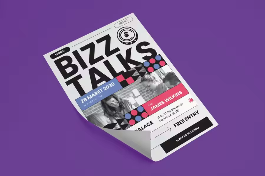 简洁现代的传单模板,专为商务会谈、研讨会、会议和工作坊设计。该模板采用粗体字体、专业布局和醒目的强调色,非常适合推广活动、演讲嘉宾和场地。模板完全可编辑和自定义,适合各种专业和企业活动,无论是打印还是电子版共享。