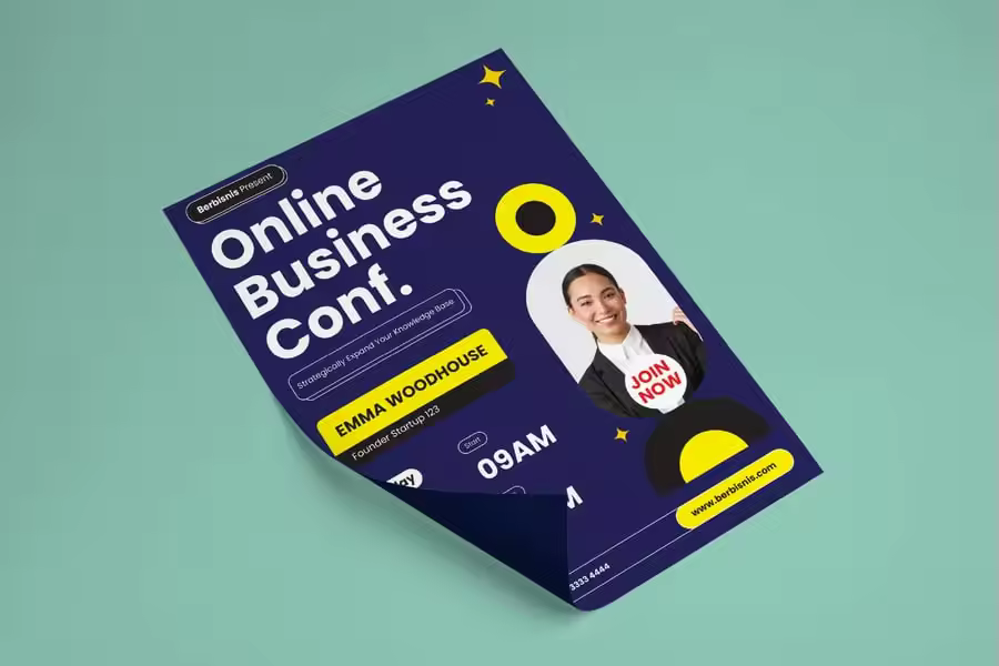 一款现代专业的传单模板,专为在线商务会议、网络研讨会、研讨会和企业活动设计。该模板采用粗体字体、简洁布局和鲜艳的元素,非常适合宣传主题演讲者、日程安排和活动详情。模板完全可编辑和自定义,以满足各种专业用途,无论是数字推广还是平面媒体。