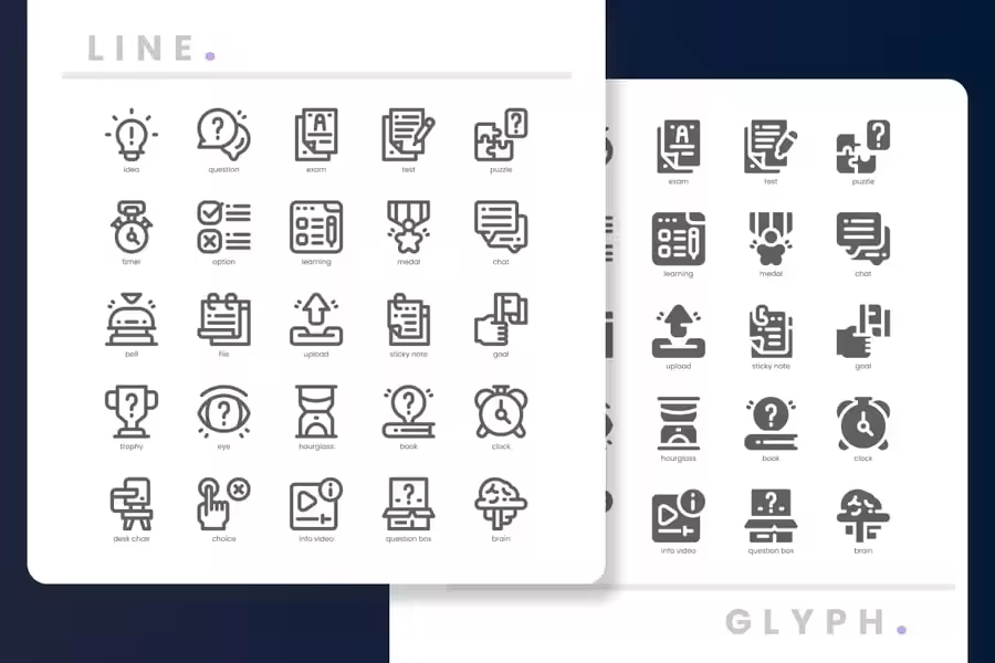 **考试图标包** 包含 100 个时尚图标,展现热门服务和创意。非常适合网站设计、移动应用程序、演示文稿、分析报告、信息图表和模板。