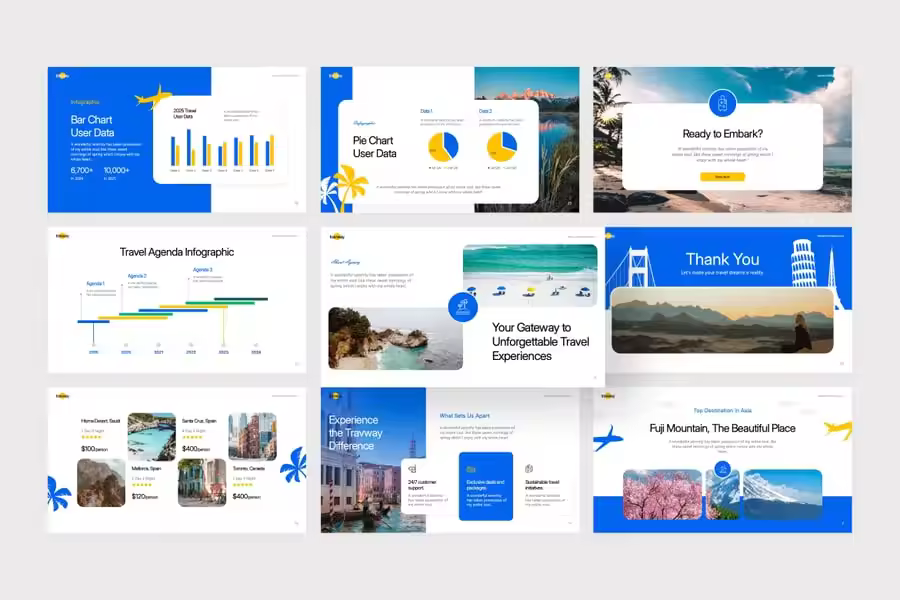 是一种创意风格的演示模板,非常适合旅行、旅游、商务演示、样本幻灯片、项目推介以及更多用途。