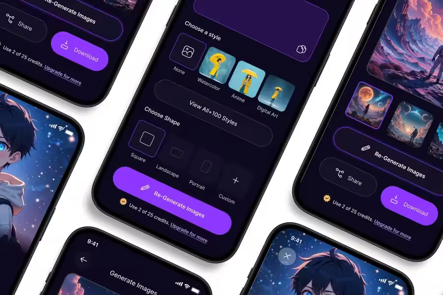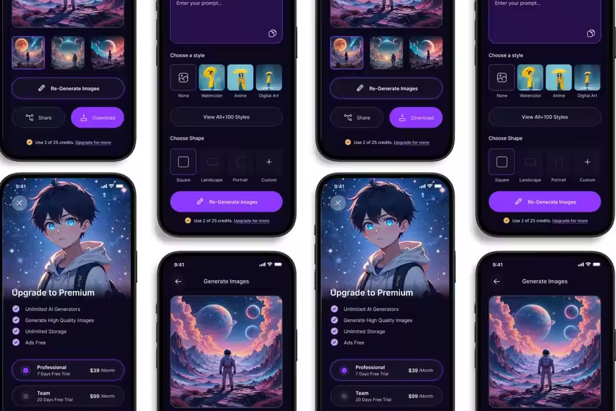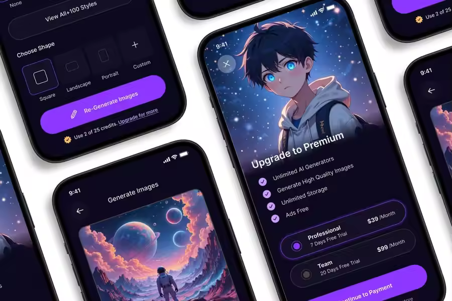 **图片生成器** UI 套件的设计注重易用性和一致性,让您轻松创建美观实用的移动应用。每个元素都经过精心设计,完全可定制,并可根据您的品牌进行调整。无论您是设计社交应用、电商应用还是生产力工具,这款套件都能让您灵活地将创意轻松转化为现实。