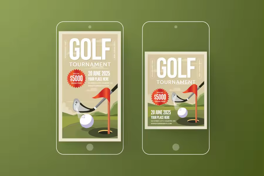 示例用例包括推广高尔夫锦标赛、宣传高尔夫球场或创建与这项运动相关的社交媒体内容。该模板的灵活性和可定制性使其非常适合从专业营销到社交媒体推广等各种应用。