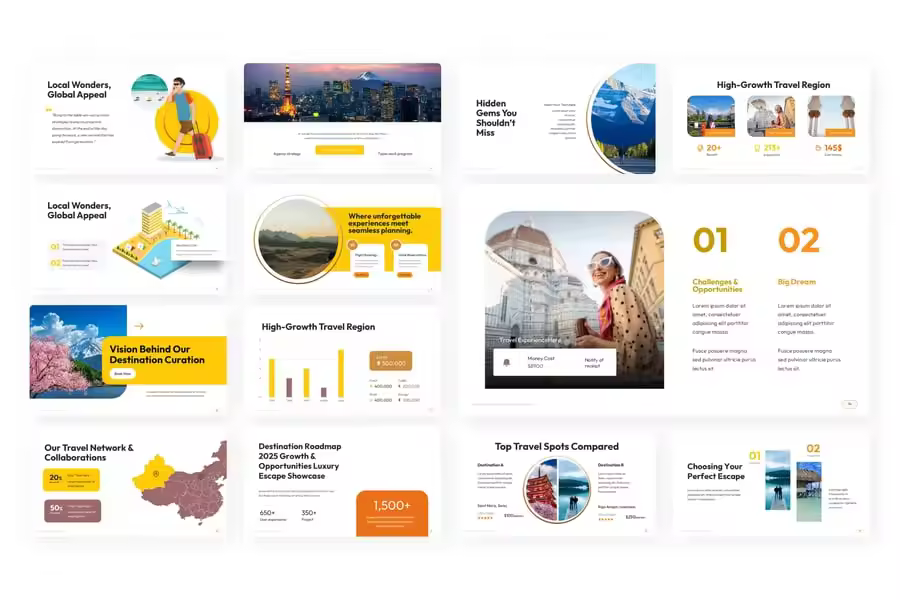 **旅行社目的地 PowerPoint 模板** 是一款充满活力且设计专业的演示文稿,非常适合推广旅游目的地、旅游活动和度假套餐。该模板布局简洁,图片丰富,并采用引人注目的黄色点缀,非常适合旅行社、旅游局、酒店集团和活动组织者,旨在给利益相关者和客户留下深刻印象。无论您是推出新的旅游服务、推介旅游发展战略,还是展示区域景点,此模板都能提供灵活的布局,用于数据可视化、导游、游客统计数据、宣传内容等。