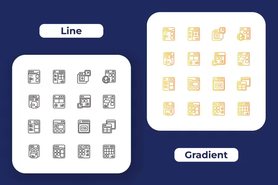 一个现代且功能多样的图标包,专为网站、移动应用、书籍、社交媒体、信息图表、传单、印刷品、横幅、海报等设计。包含 64 个图标,四种风格:**线条、实心、双色调和渐变**。
