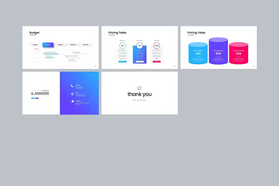 使用营销计划演示模板,以专业简洁的方式展示您的作品。这款模板设计简洁现代,功能强大,包含创意照片布局、信息图表、表格、矢量图标、示意图以及大量实用功能,可将您的作品和公司形象提升到一个新的高度。