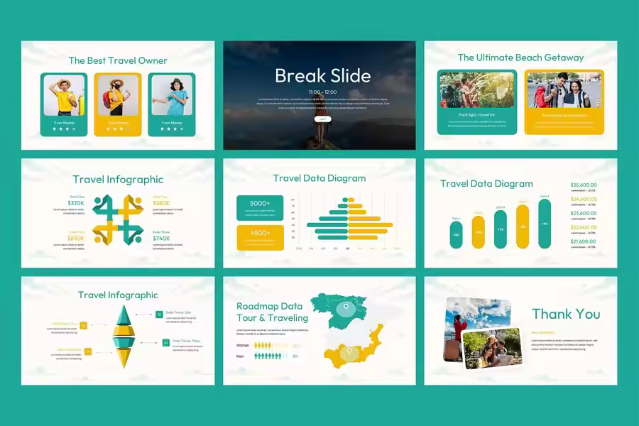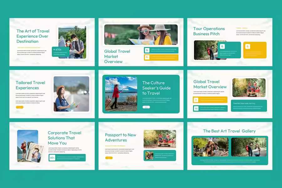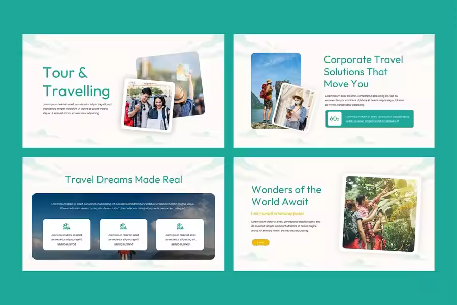 对于希望以专业且视觉冲击力强的方式展示服务的旅行社、旅行社运营商、度假规划师和旅游营销人员来说,旅游和旅行 Google 幻灯片演示模板是理想之选。该模板采用简洁、现代且充满冒险精神的美学设计,可帮助您以独特的风格展示目的地、行程、旅行套餐和客户评价。借助完全可编辑的 Google 幻灯片,您可以轻松自定义颜色、图像、字体和布局,以匹配您的品牌。
