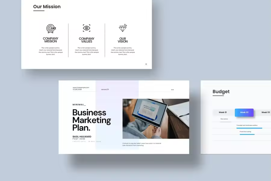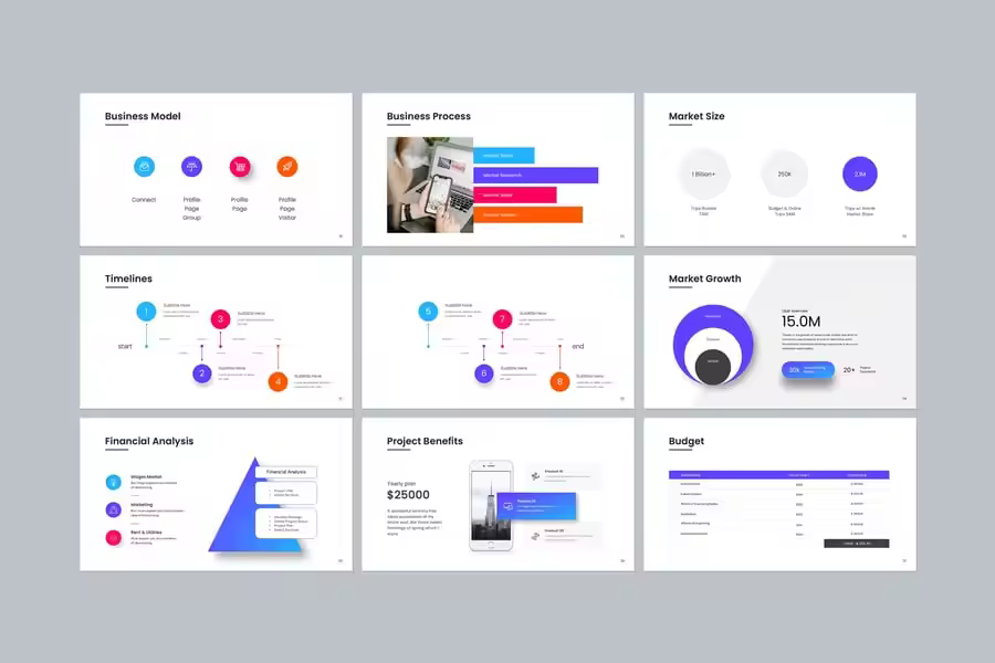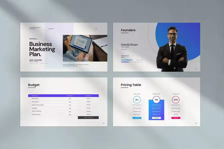 使用营销计划演示模板,以专业简洁的方式展示您的作品。这款模板设计简洁现代,功能强大,包含创意照片布局、信息图表、表格、矢量图标、示意图以及大量实用功能,可将您的作品和公司形象提升到全新高度。