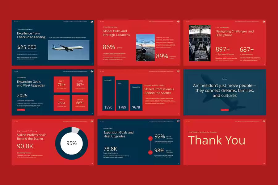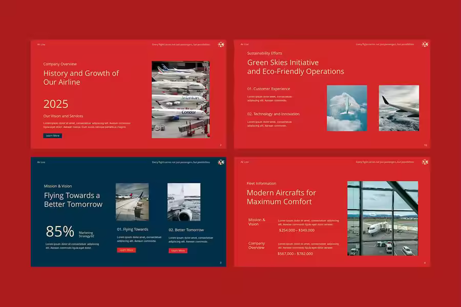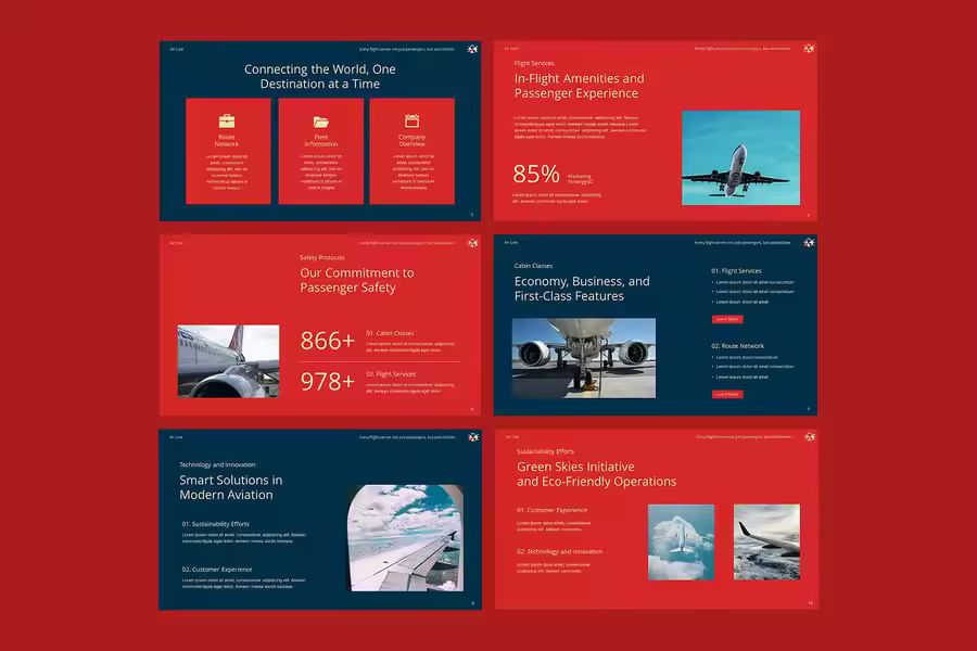 使用航空公司 Google 幻灯片演示模板,将您的航空演示提升到新的高度——这款模板设计专业,完全可编辑,非常适合航空公司、航空初创公司、飞行学校、旅行社和机场运营商。该模板拥有现代化的布局、引人入胜的信息图表、目的地地图、航班时刻表、机队展示和乘客服务概览,非常适合向投资者推介、展示年度报告或营销您的航空公司服务。该模板专为 Google 幻灯片设计,提供拖放式图片占位符、可自定义的配色方案和矢量图标,可轻松适应您的品牌。