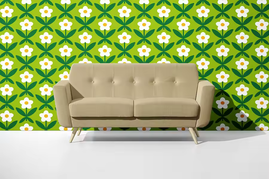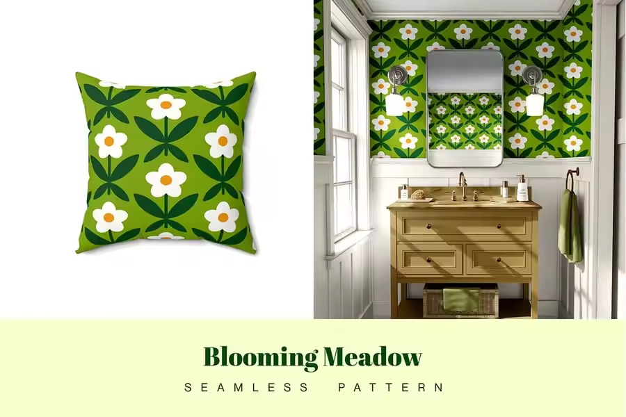 无缝衔接的盛开草地图案,以鲜花、树叶和自然元素为特色。非常适合纺织品、壁纸、包装以及需要活力花卉元素的装饰项目。