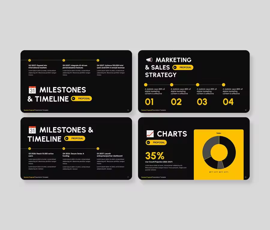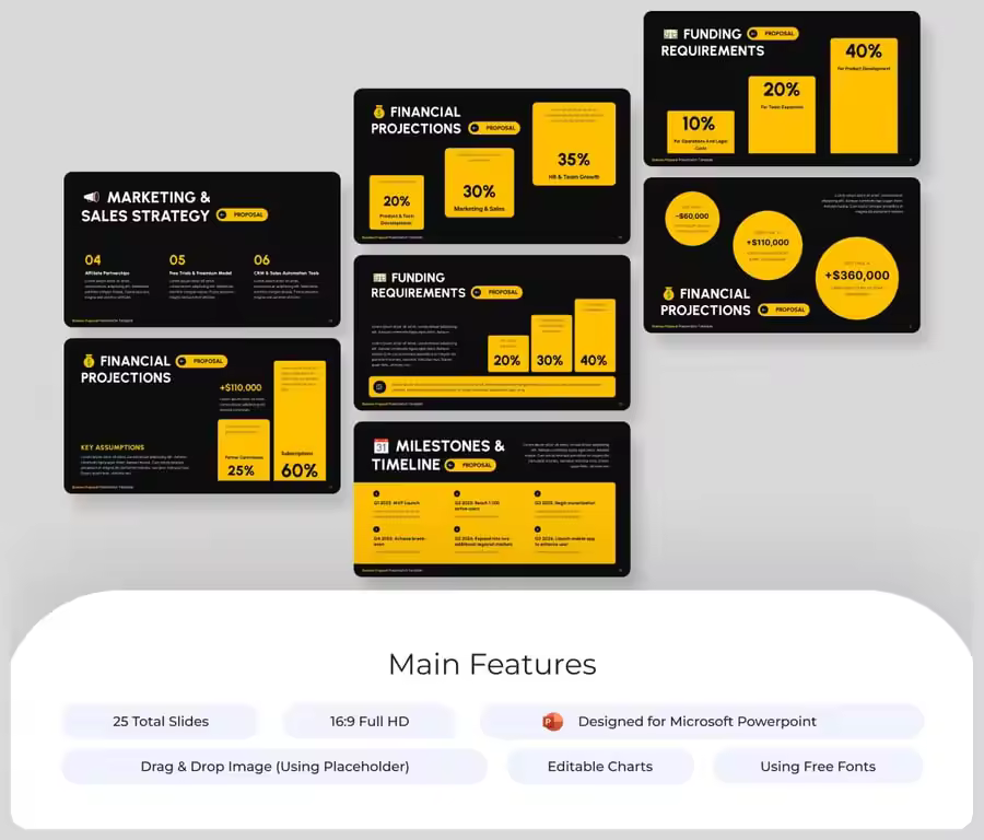 通过精心设计的幻灯片,您可以清晰地定义问题,展示您的创新解决方案,概述资金需求,并展示您的营销策略。该模板还提供了专门的章节,用于里程碑、时间表、财务预测和市场分析,确保您以引人入胜的方式涵盖所有要点。