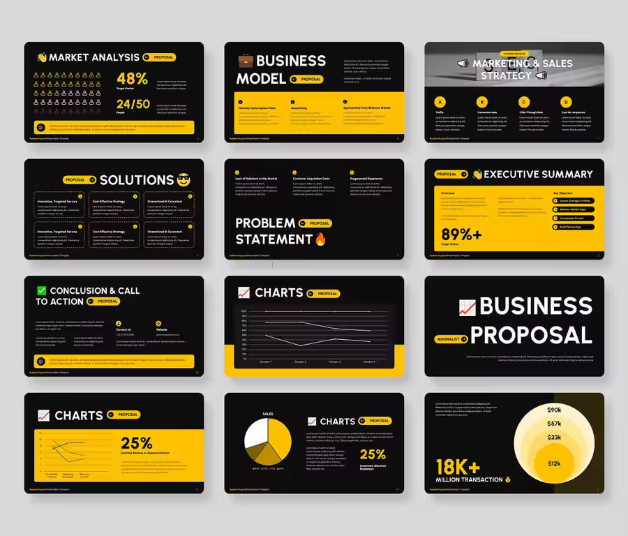 商业计划书 | 问题陈述 | 解决方案 | 资金需求 | 里程碑和时间表 | 营销和销售策略 | 财务预测 | 市场分析 | 商业模式 | 执行摘要 | 图表 | 结论和行动号召