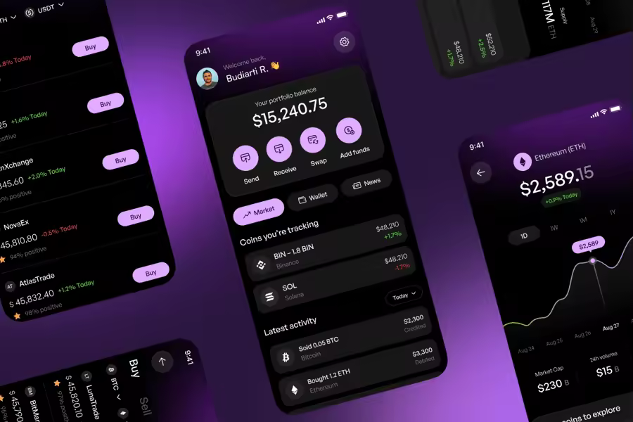 CoinSphere – 加密货币移动应用 UI 套件是一款现代专业的设计模板,用于创建数字钱包、加密货币交易和财务管理应用程序。它采用时尚的深色界面,提供用于追踪加密货币、发送/接收加密货币、查看市场趋势和管理投资组合的布局。