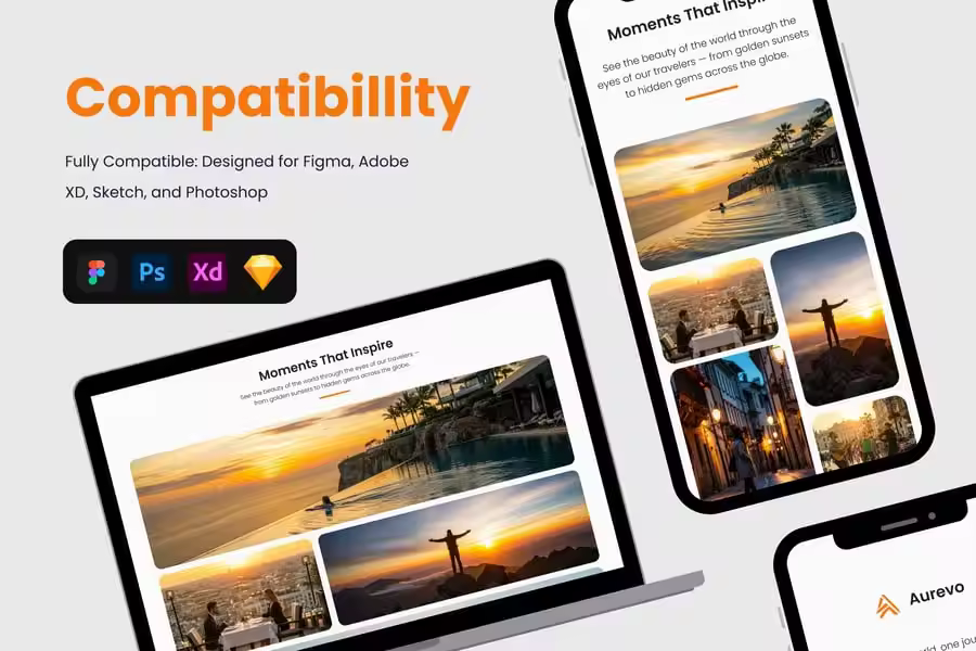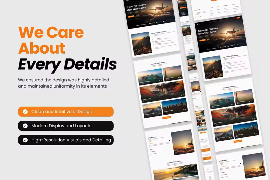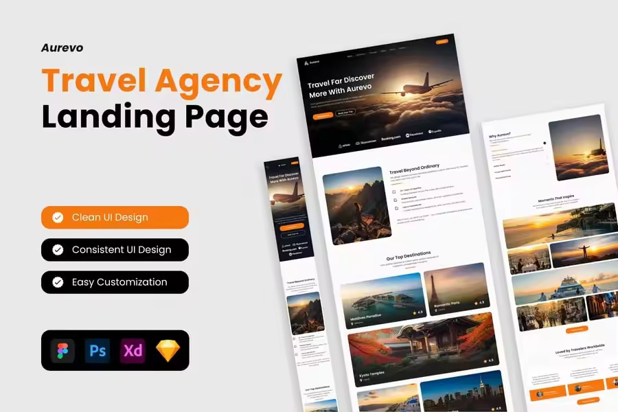 Aurevo 是一款现代化的落地页模板,专为希望激发旅行者兴趣并将访客转化为客户的旅行社、旅行社和预订平台而设计。凭借其简洁的布局、惊艳的视觉效果和注重转化率的版块,该模板可帮助您推广目的地、建立信任并提升预订量。
