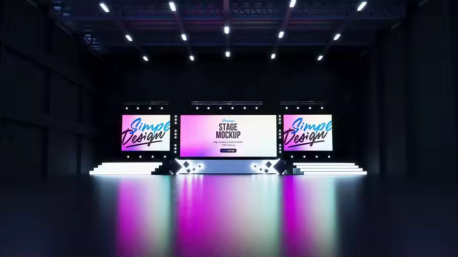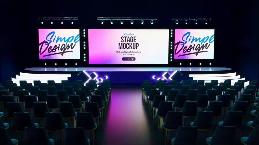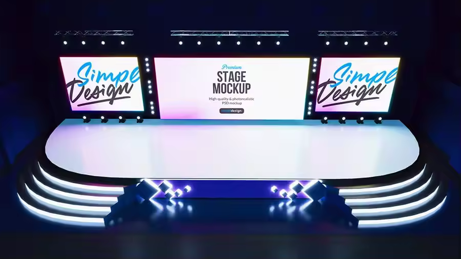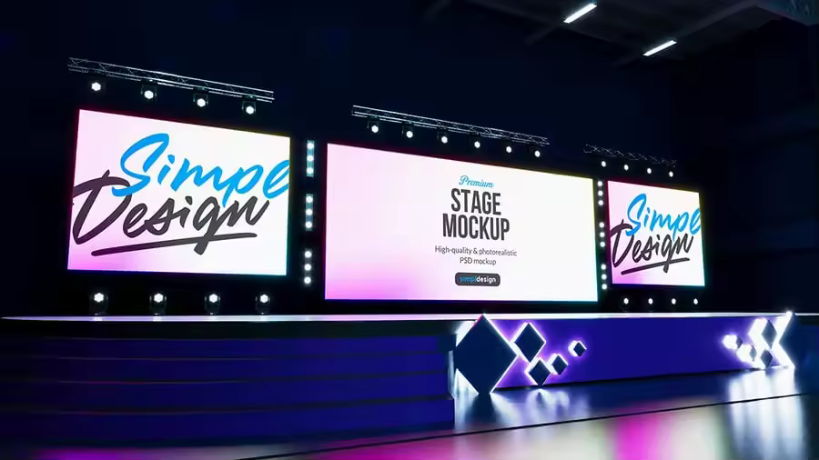 使用这套包含**4个舞台模型**的套装,以正确的方式展示您的**LED屏幕舞台设计**和**模板**!只需使用Photoshop智能对象,单击一下即可放置您的设计。就这么简单!