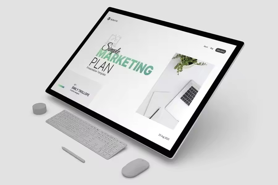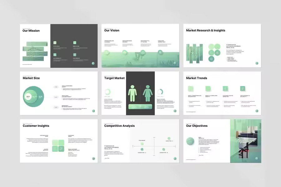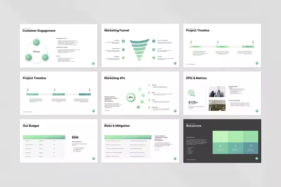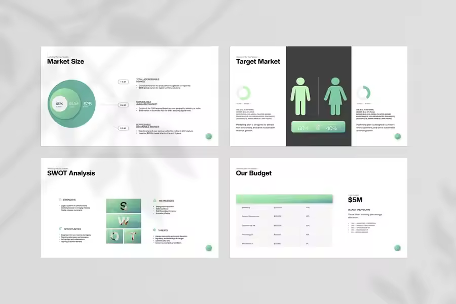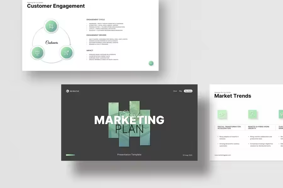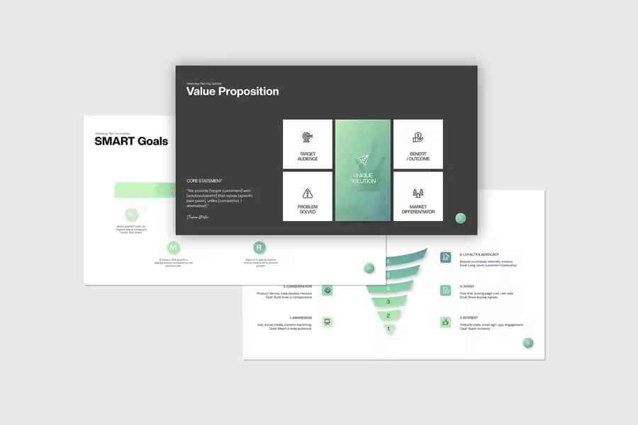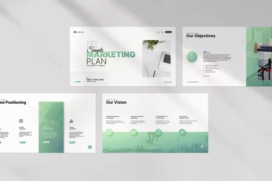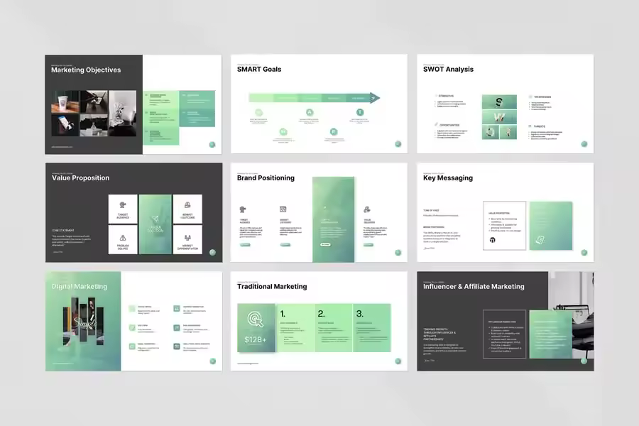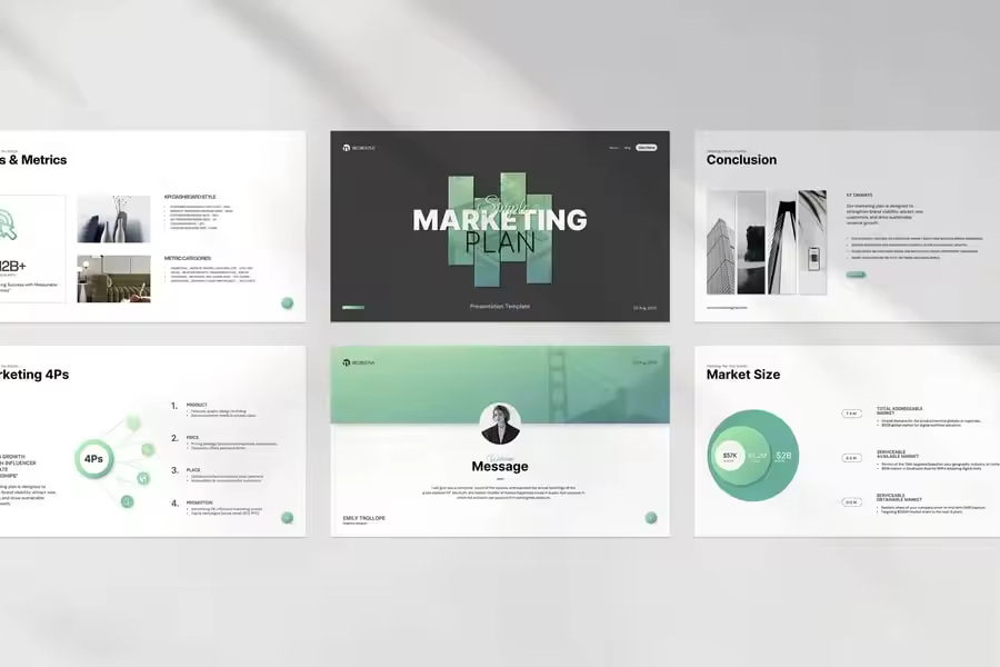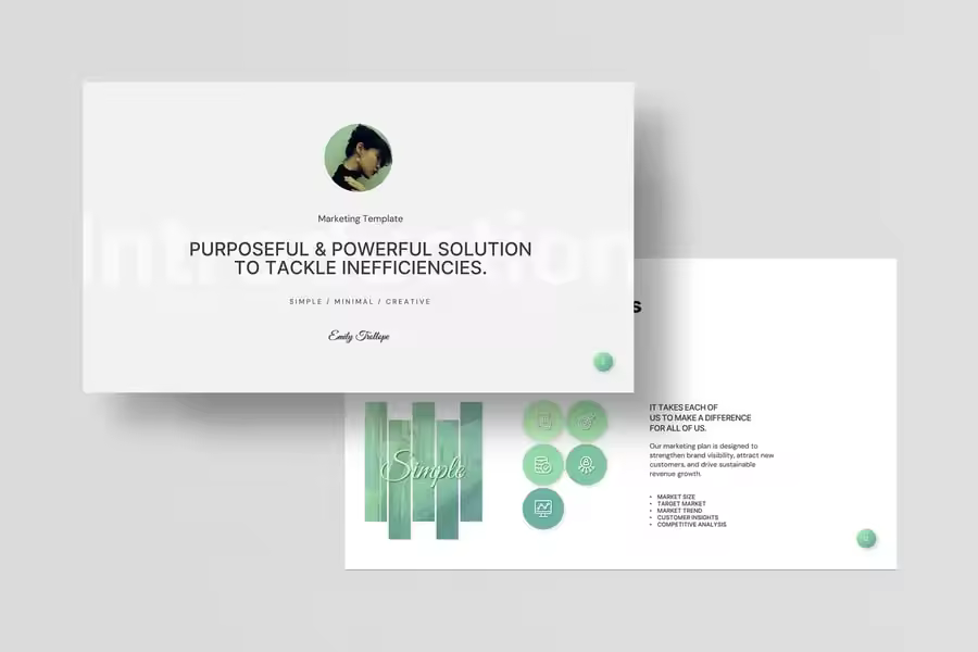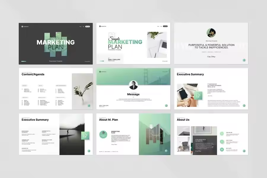 使用简洁的营销计划演示模板,以专业简洁的方式展示您的作品。这款模板设计简洁现代,功能强大,包含创意照片布局、信息图表、表格、矢量图标、图表以及大量实用功能,可将您的作品和公司简介提升到一个新的高度。