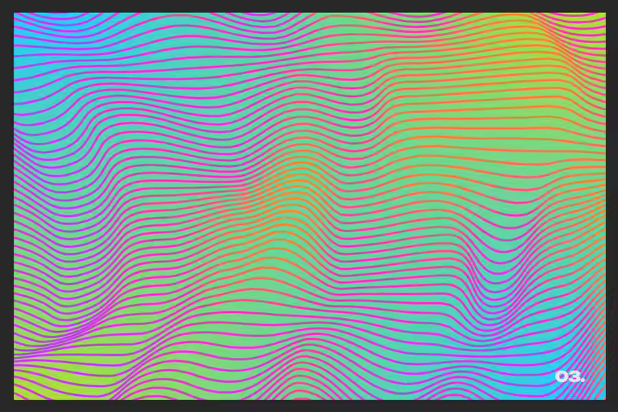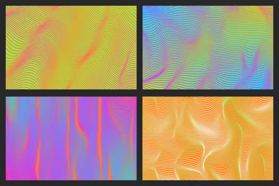 这组抽象的波浪线背景采用色彩鲜艳的渐变纹理,并带有迷幻的扭曲和流畅的运动效果。这些充满活力的图形非常适合海报、专辑封面、数字艺术和现代设计项目,带来动感的能量和超现实的视觉深度。