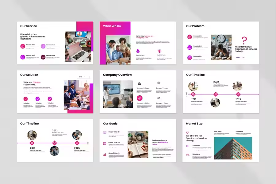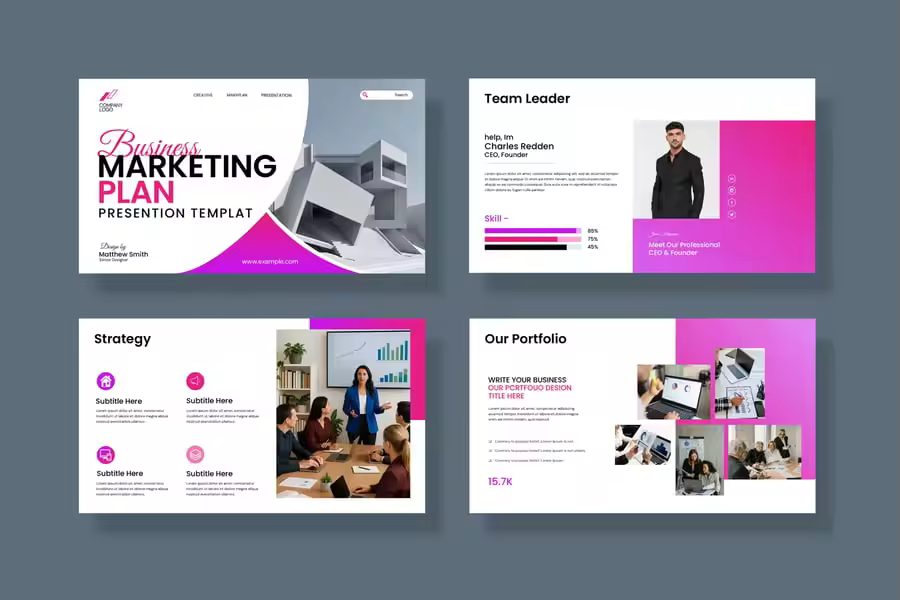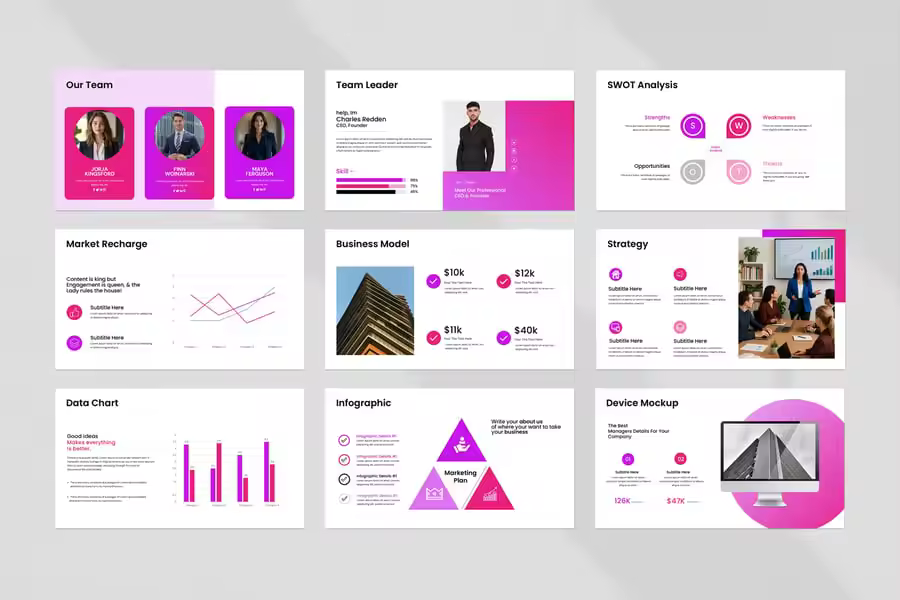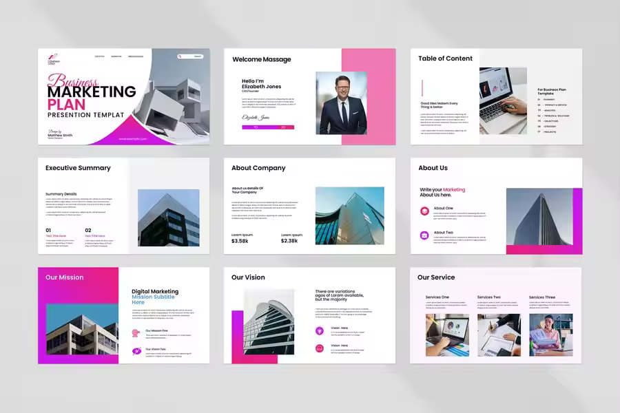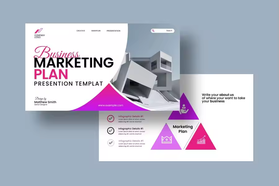 使用营销计划演示模板,以专业简洁的方式展示您的作品。这款模板设计简洁现代,功能强大,包含创意照片布局、信息图表、表格、矢量图标、示意图以及大量实用功能,可将您的作品和公司形象提升到一个新的高度。