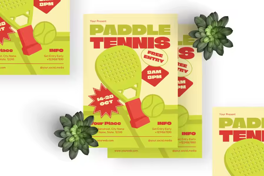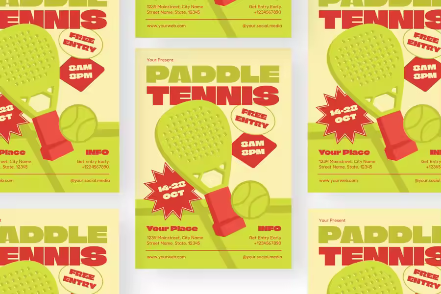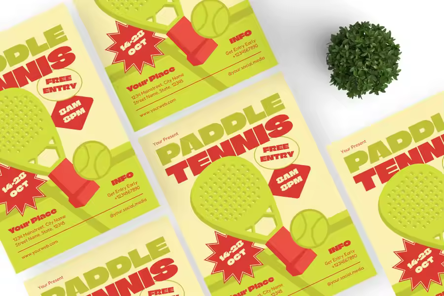 我们的**Paddle Match**传单套装带来惊艳的视觉冲击。我们精心设计,可根据您的品牌或业务进行个性化定制。无论您展示哪个行业、服务或产品,我们都能为您提供理想的传单套装。