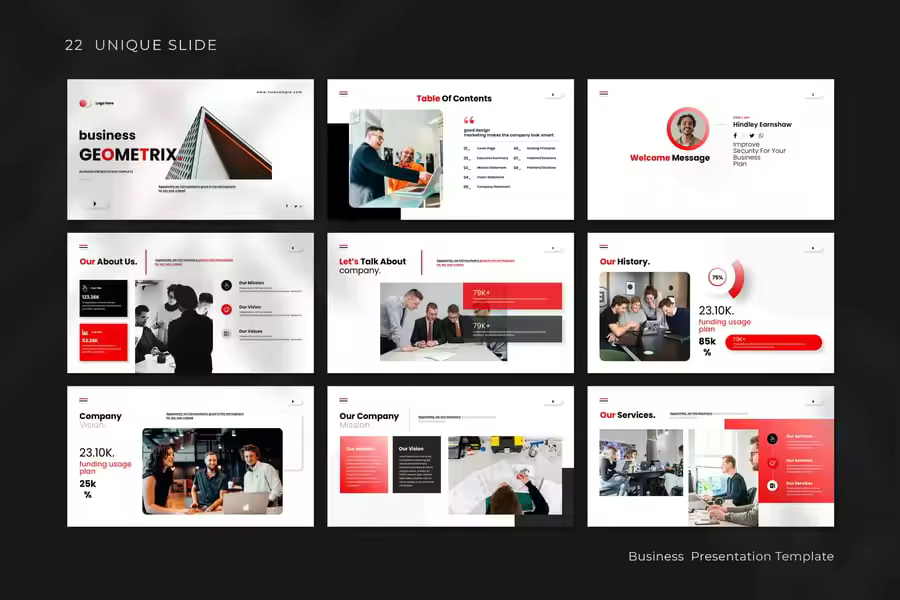 使用这款完全可编辑的商业 Geometrix PowerPoint 模板,清晰专业地展示您的愿景。这款可自定义的幻灯片非常适合企业家、初创企业和商业领袖,它能以引人入胜的视觉形式,帮助您概述商业战略、市场分析、财务预测和增长计划。
