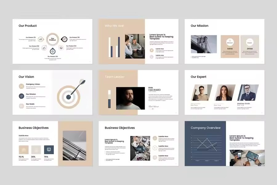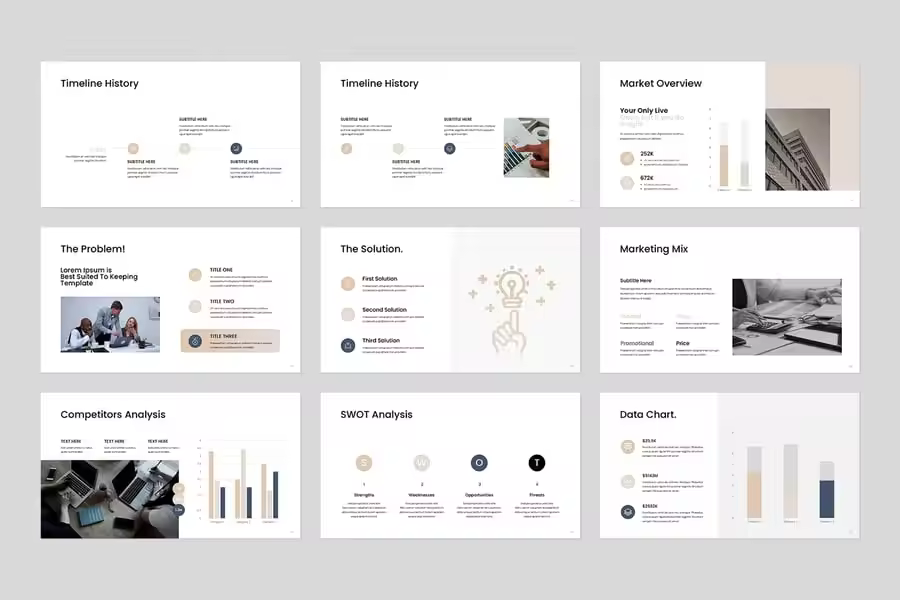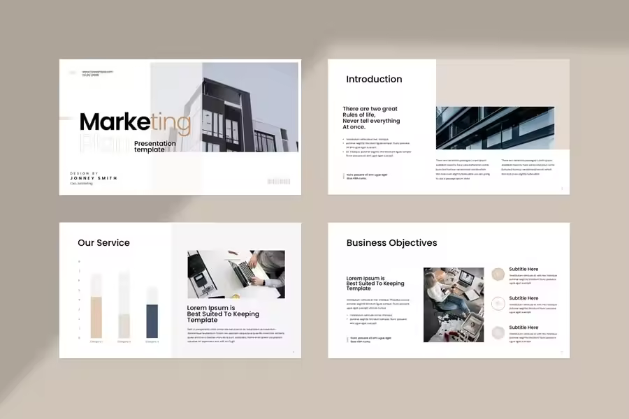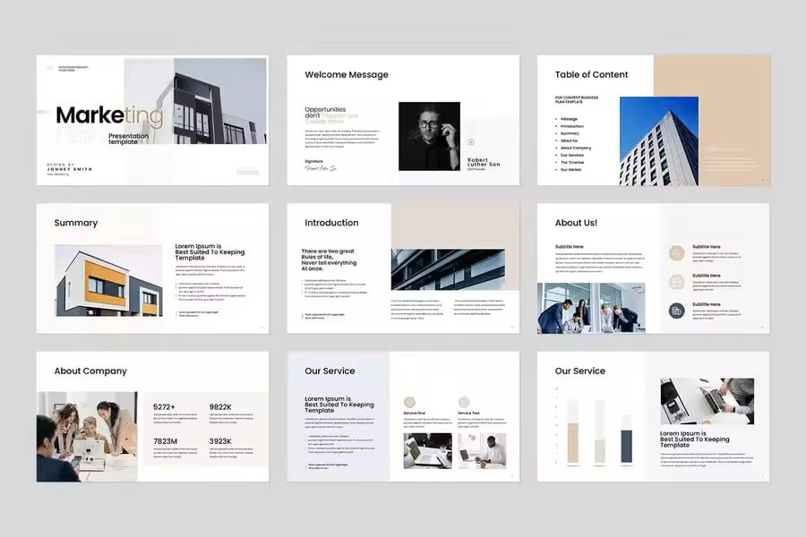 以专业、干净的方式展示您的作品,营销计划演示模板采用简单现代但功能强大的设计,包括创意照片布局、信息图表、表格、矢量图标、图表和大量出色的功能,可在另一个层面上展示您的工作和公司简介。
