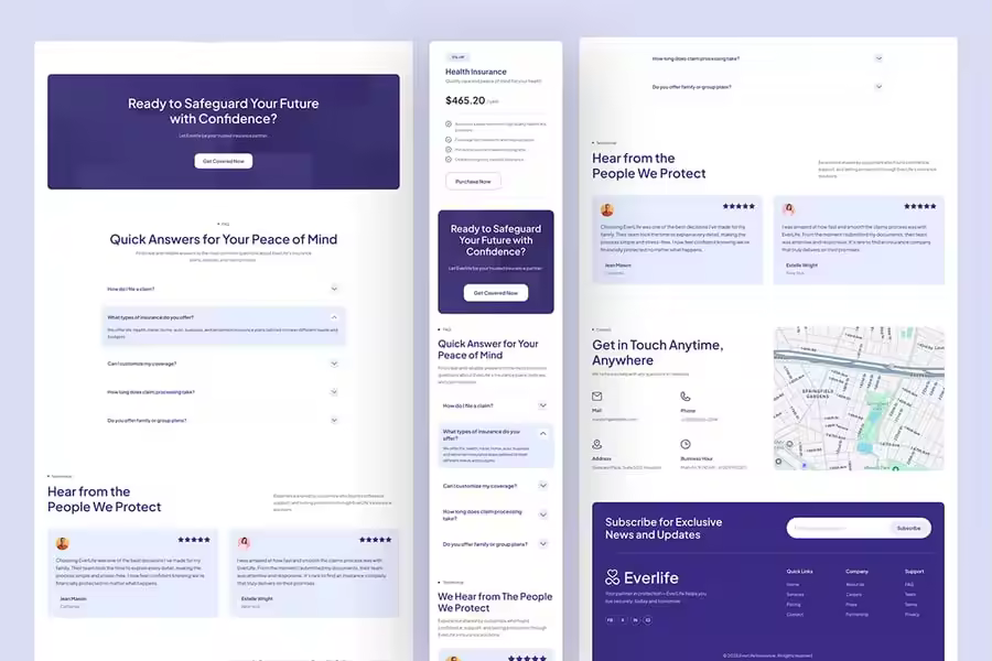 使用 EverLife,安心保障未来。EverLife 是一款现代专业的保险登陆页面 UI 模板,旨在建立信任、吸引咨询并推广服务。该模板采用 Figma 设计,提供桌面和移动端视图,帮助保险提供商、财务顾问和保障计划机构清晰可信地展示其产品。