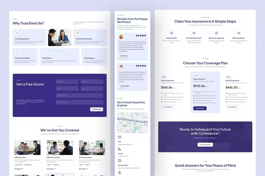EverLife 的设计理念围绕真实用户如何在线探索保险选项而构建。从详细的服务说明到可视化的比较表和即时咨询表单,每个设计元素都经过优化,以降低跳出率并促进注册。无论您是构建新网站还是改造旧网站,此模板都能为您提供可靠的基础,打造极具说服力的数字体验。凭借直观的导航和增强信任的设计,它帮助用户在决策过程中获得更多信息并充满信心,最终提高参与度和转化率。