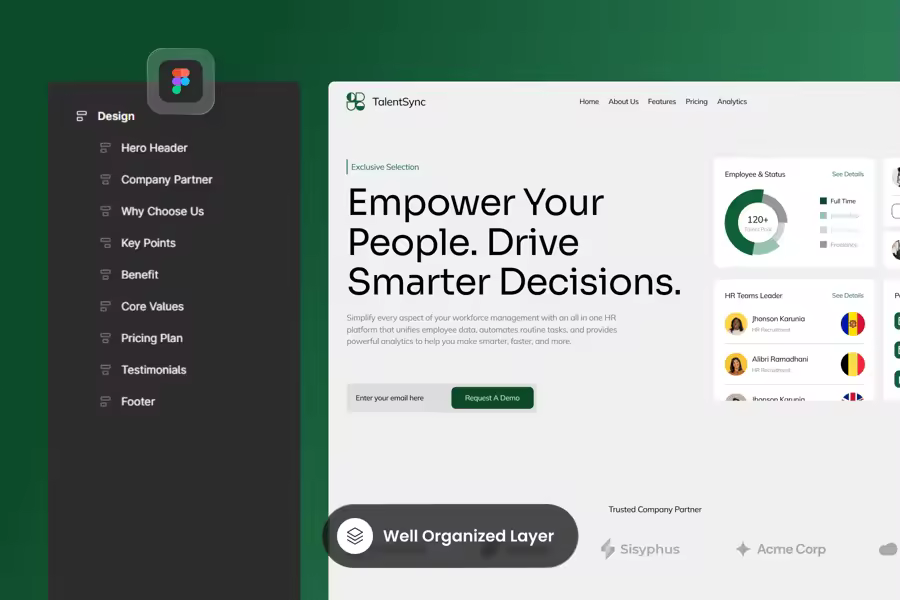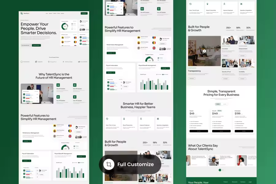 TalentSync 是一个现代化的人力资源平台落地页,旨在展示全面的劳动力管理解决方案。它采用简洁的数据驱动美学和引人入胜的视觉效果,突出了薪资自动化、福利管理、高级分析和无缝集成等强大功能。页面结构清晰明了。