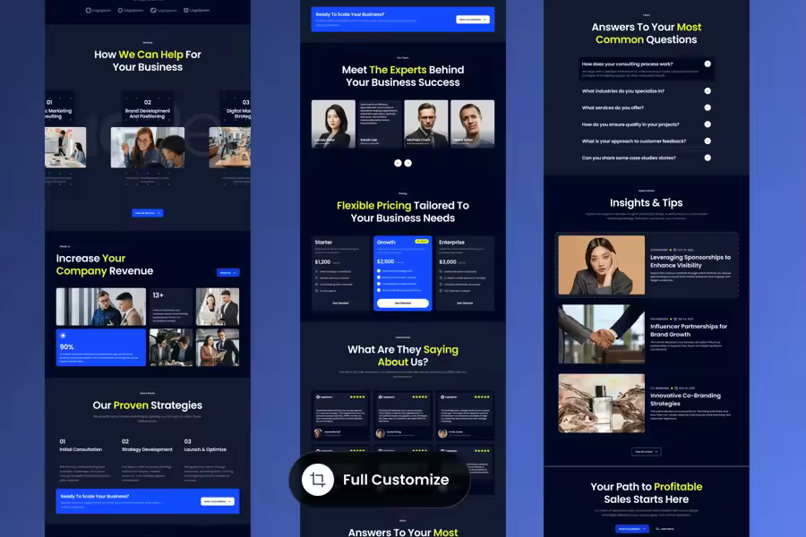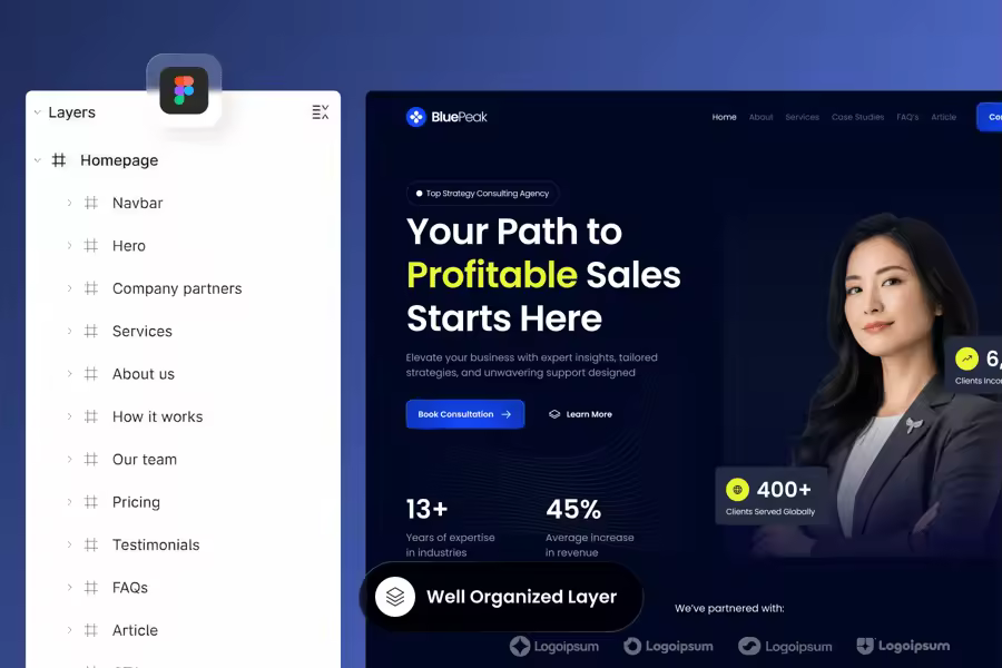 BluePeak 是一款简洁专业的落地页模板,专为咨询机构和商业战略公司设计。它采用现代且结构化的布局,让您能够以清晰易懂的方式展示您的服务、成熟的策略、定价方案和专业的团队成员。该设计突出了信任、专业知识和成果,让潜在客户轻松了解您的机构带来的价值。