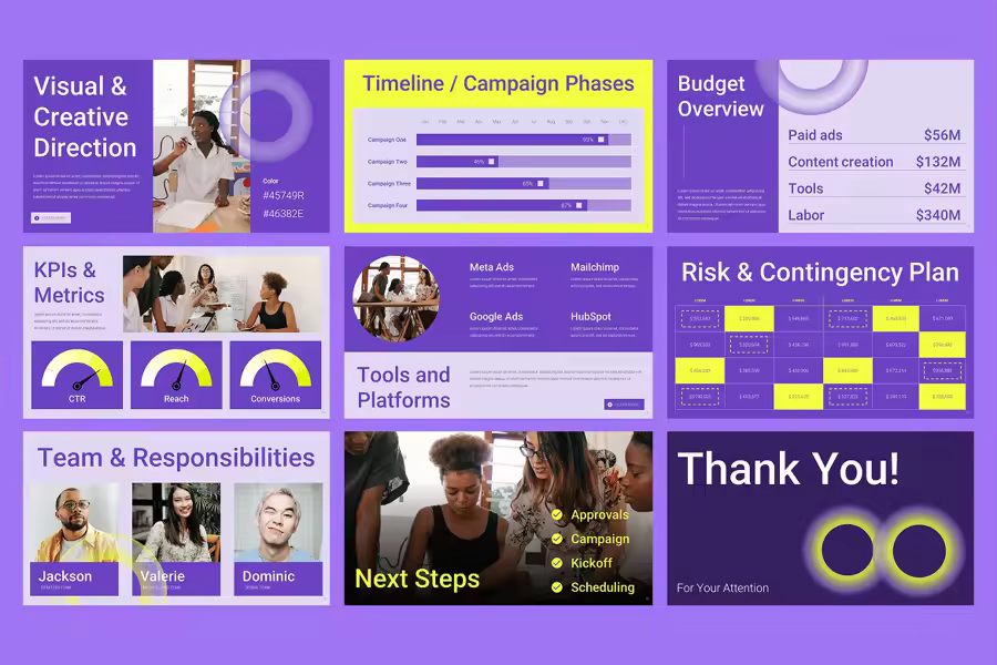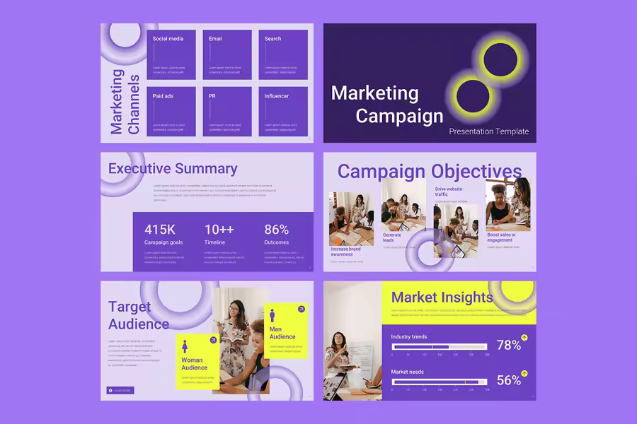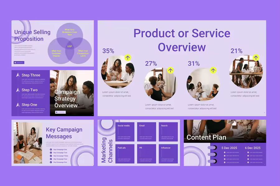 使用营销活动 Google 幻灯片演示模板,高效地规划、展示和执行营销活动。该模板采用现代、创意且专业的布局设计,非常适合需要展示营销活动策略、执行计划和绩效结果的营销团队、代理机构、初创公司和商务人士。模板拥有独特的幻灯片,涵盖了打造成功营销活动所需的一切:营销活动目标、目标受众资料、市场调研、内容策略、社交媒体计划、营销漏斗、预算分配、关键绩效指标 (KPI)、时间表和营销活动绩效报告。每张幻灯片都经过精心设计,清晰易懂、富有影响力且引人入胜,帮助您给客户、利益相关者或内部团队留下深刻印象。该模板 100% 可自定义,包括拖放式图片占位符、可编辑图表、矢量信息图和可调整的配色方案,让您轻松定制以符合您的品牌形象。无论您是在准备客户推介、营销活动提案还是内部营销评估,此模板都能确保您的信息以专业性和创意性的方式传达。