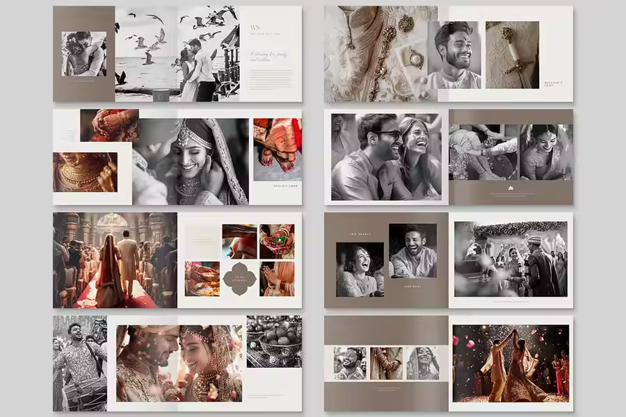 可在 Canva、InDesign IDML 和 INDD 中编辑。非常适合文化庆典、婚前拍摄、周年纪念以及高级相册、作品集和传家宝纪念册。