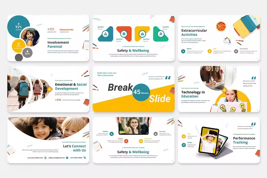 使用儿童教育学校演示模板,让学习变得生动有趣——这是一款现代、色彩丰富且完全可定制的演示文稿,旨在让教育更具吸引力和影响力。无论您是教师、学校管理员、教育顾问还是在线学习专业人士,此模板都能帮助您清晰、富有创意、自信地传达想法。