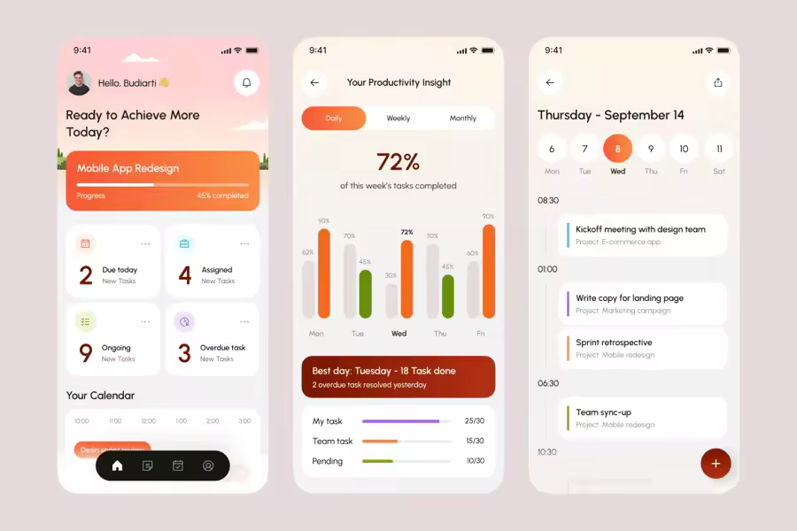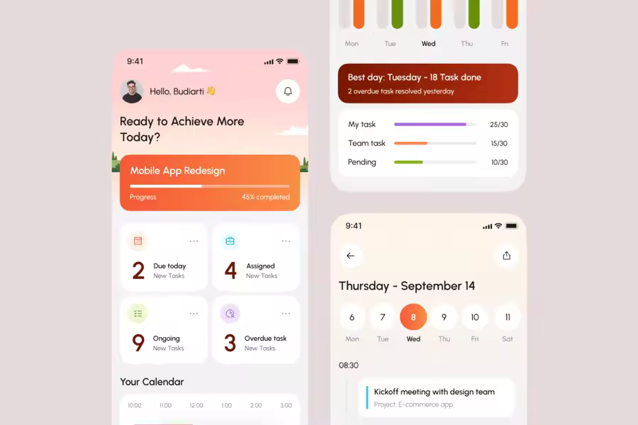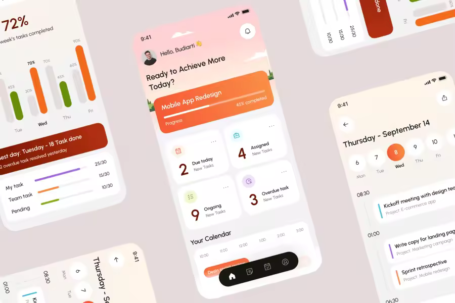 TaskFlow – 移动应用 UI 套件是一款现代专业的设计模板,专为构建生产力、任务管理和日程安排应用程序而设计。它布局简洁,流程直观,包含用于创建任务、管理项目、跟踪进度和查看生产力洞察的屏幕。
