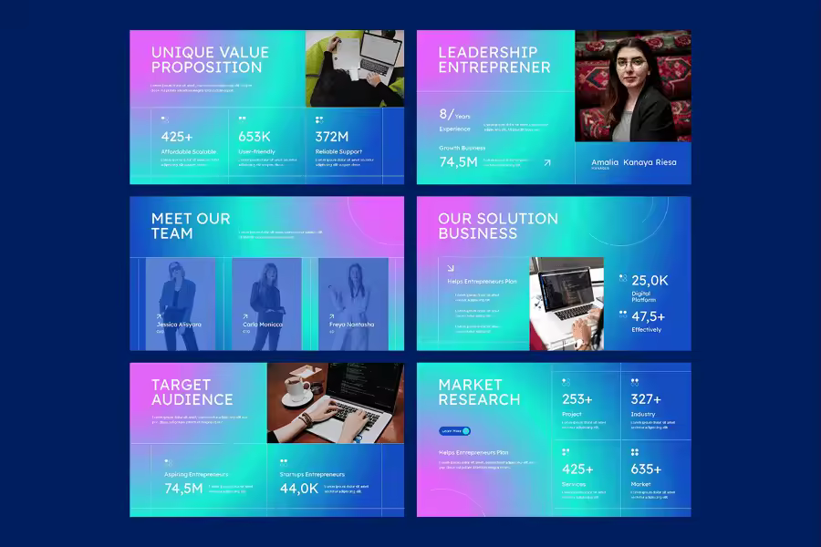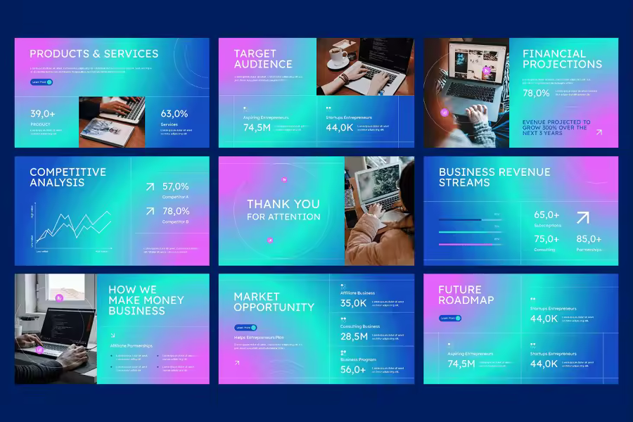 使用企业家商业 PowerPoint 演示文稿模板,将您的商业理念从愿景变为现实。这款模板专为企业家、初创企业、小企业主和创新者设计,可帮助您进行精彩的演示文稿,吸引投资者、推销新想法并自信地展示您的商业战略。该模板包含完全可编辑的幻灯片,涵盖了制作引人入胜的商业演示文稿的所有要素。从公司概况、问题与解决方案、商业模式、市场分析、竞争对手研究、增长战略到财务预测,每张幻灯片都经过量身定制,旨在帮助企业家清晰、有力地沟通。现代专业的设计确保您的内容脱颖而出,而可编辑的信息图表、图表、时间线和模型则使数据驱动的故事讲述变得轻松便捷。无论您是在准备投资者推介演示文稿、商业计划书还是初创企业战略演示文稿,这款模板都是您成功的必备工具。它包含专业设计的幻灯片,可用于展示您的公司概况、价值主张、问题与解决方案分析、目标市场、商业模式、竞争格局、财务预测以及团队介绍。它采用现代布局、视觉冲击力强的图形和可编辑图表,增强了叙事和数据可视化的效果。该模板可完全自定义,适合任何行业,助您打造引人入胜、成果显著的宣传方案。适用于创业者商业PPT、初创企业宣传演示文稿模板、创业者演示幻灯片、小型企业PPT模板、投资者宣传PPT、商业战略演示文稿、创业者计划幻灯片、现代商业PPT