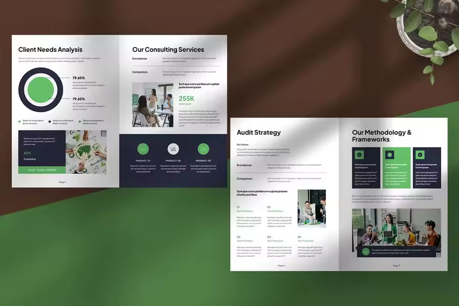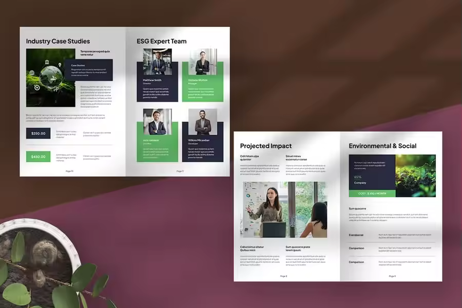 这款专业的提案模板布局简洁,结构清晰,以清新的绿色和精致的海军蓝点缀,体现了增长、责任和信任的主题。它为 ESG 可持续发展咨询提供了一个全面的框架,涵盖客户需求分析、咨询服务、审计策略、环境和社会影响以及行业案例研究。该设计将现代视觉效果与清晰的排版相得益彰,确保复杂的信息以专业且易于理解的方式呈现。它非常适合企业责任倡议,突出了可持续实践并展现了可信度,同时保持了视觉吸引力和易于浏览的格式。