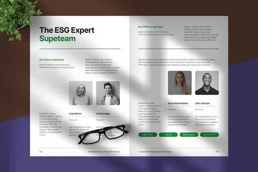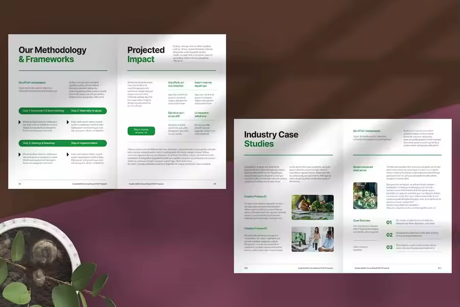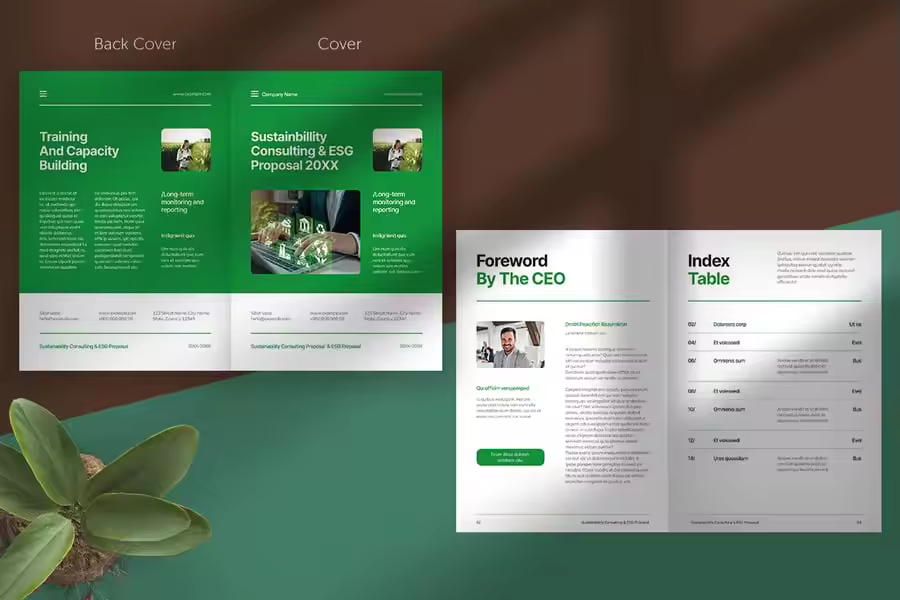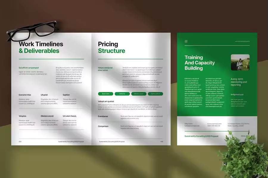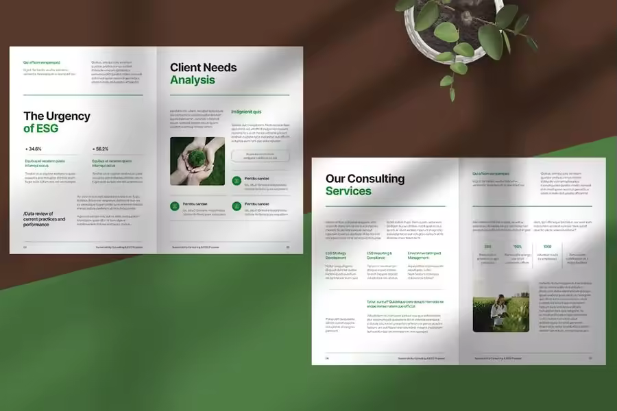 这份简洁的 ESG 和可持续发展咨询方案以绿色为点缀,旨在以专业且富有影响力的方式呈现企业的环境和社会战略。方案布局均衡,字体清晰,视觉效果现代,强调清晰度和可读性,使复杂的信息易于理解。绿色点缀突出了关键部分,并强化了生态意识和可持续发展的主题,而留白则确保了设计清新简洁。该方案非常适合咨询公司、环保机构和企业责任倡议组织,展现了企业对可持续发展实践的信任、专业知识和坚定承诺。