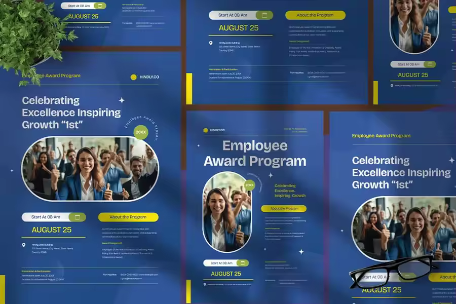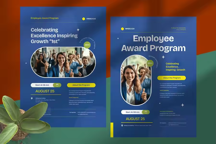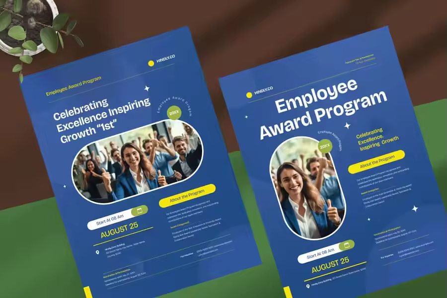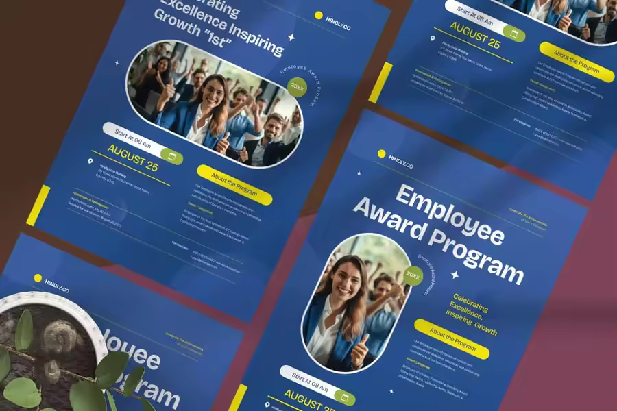 这些传单采用专业而现代的布局,旨在突出员工表彰和庆祝活动。简洁的设计采用深蓝色背景,与鲜艳的黄色点缀形成鲜明对比,营造出精致而令人振奋的视觉效果。传单通过清晰易读的版块,清晰地呈现活动详情、项目亮点和奖项类别。大胆的字体和均衡的构图使其非常适合企业环境,同时又保持了引人入胜且平易近人的风格。这些传单是宣传颁奖典礼、表彰活动或企业庆典的理想之选,将专业性与活力完美融合。