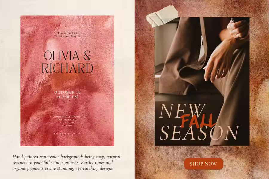 这些纹理采用天然色素精心打造,在水中完美分离,呈现出细腻的流动感、柔和的颗粒感和泥土般的纹理,令人联想到苔藓、落叶和雨水浸透的地面。温暖的巧克力色、米色和酒红色调,搭配原始的触感美感,为任何设计增添深度和舒适的氛围。