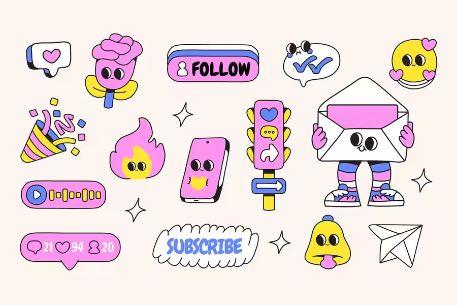 此素材包包含各种代表社交媒体参与和数字通信的图形。元素包括点赞、关注、订阅和消息的图标,通常以富有表现力的拟人化特征进行描绘。其他视觉元素包括智能手机、铃铛、五彩纸屑发射器和燃烧的火焰,所有这些都构成了数字互动和警报的主题。
