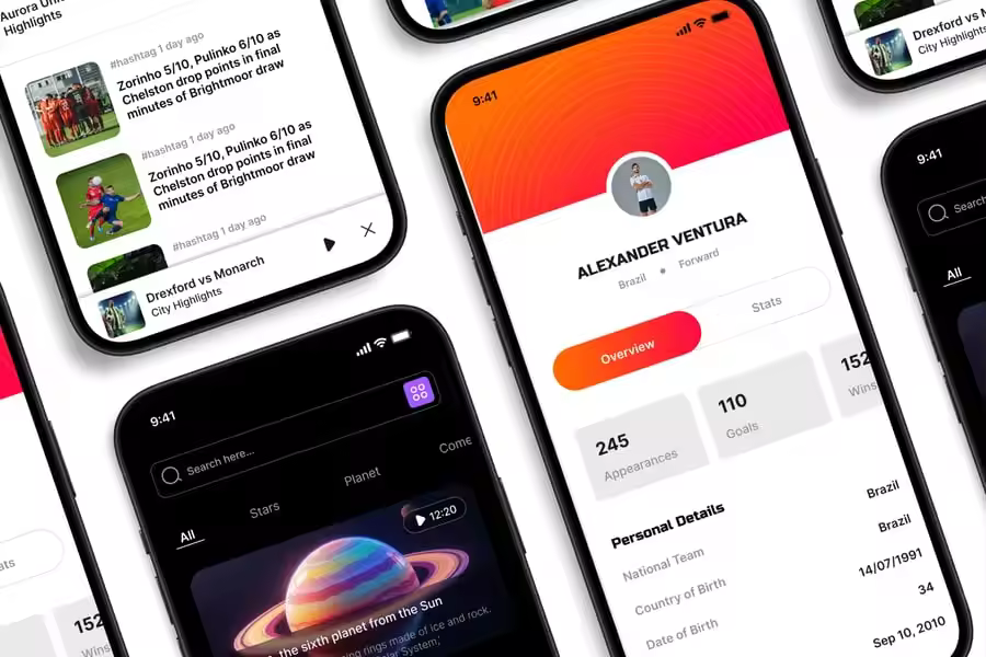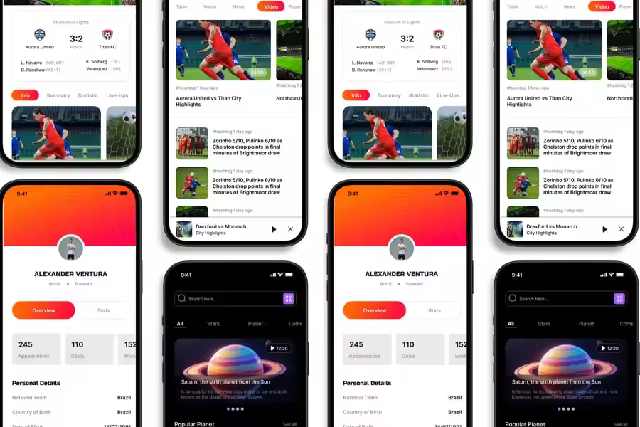 隆重推出**体育新闻**移动应用 UI 套件,它是一款现代化且功能丰富的解决方案,可用于创建简洁、用户友好的应用界面。对于希望加快设计流程的设计师和开发者来说,这款 UI 套件完美契合,它在一个有序的软件包中提供了所需的所有基本组件。