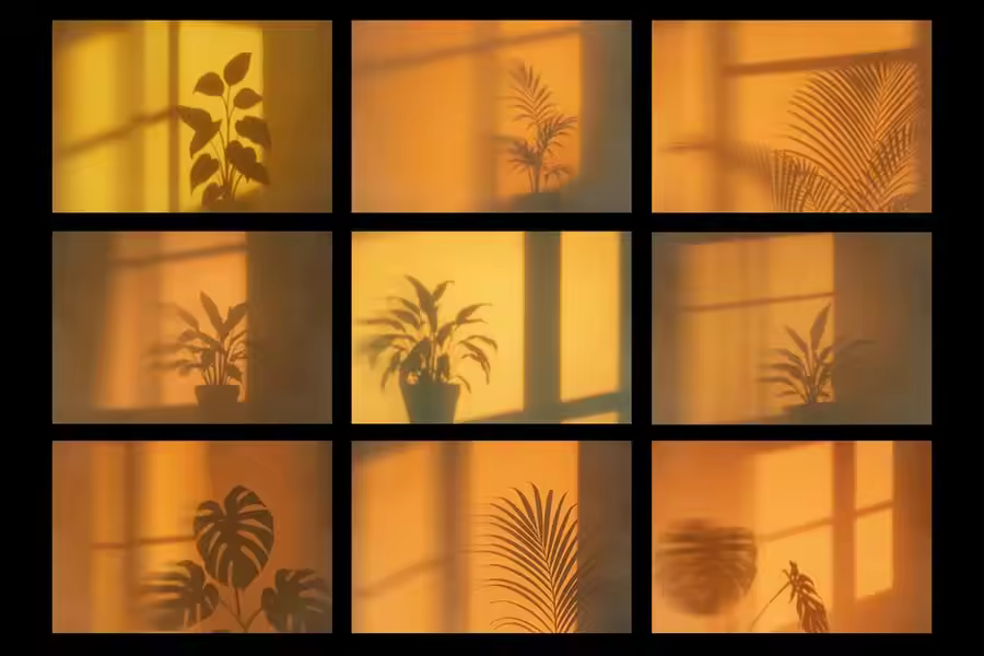一组宁静的背景,展现了夕阳的柔和光影和植物在纹理墙面上的影子。温暖的金色色调和柔和的渐变色营造出舒适怀旧的氛围,非常适合追求宁静自然之美的项目。这些背景能为任何视觉呈现增添一丝温暖与亲切感。