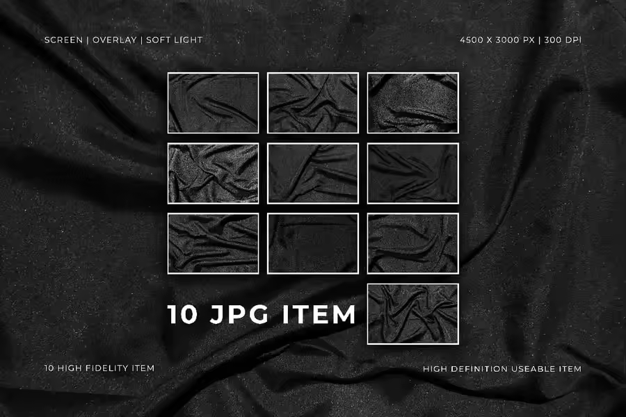 10 款高分辨率黑色天鹅绒面料纹理合集,旨在为您的创意项目增添深度、优雅和真实感。这些纹理拥有自然的褶皱和精致的细节,非常适合用作平面设计、摄影、模型、演示文稿和数字艺术作品中的叠加层、背景或纺织元素。