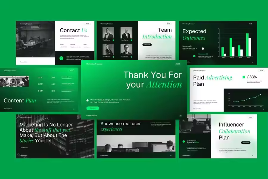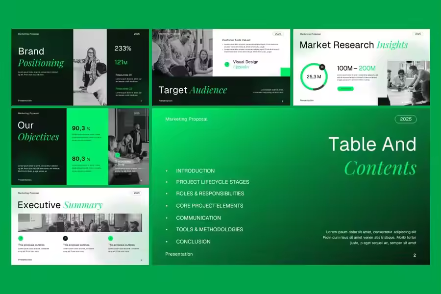 使用“执行营销提案 PowerPoint 演示文稿模板”,自信地展示您的营销策略和商业提案。此模板专为营销高管、代理机构、业务顾问和企业团队打造,可帮助您交付专业的提案、营销活动策略和商业计划,从而打动客户和利益相关者。此模板拥有简洁现代的幻灯片,包含执行摘要、提案目标、市场调研、竞品分析、营销漏斗、定价表、投资回报率预测和行动计划的布局。它专为高效设计,具有可编辑图表、矢量信息图、拖放式图像占位符以及完全可自定义的布局,以匹配您的品牌形象。