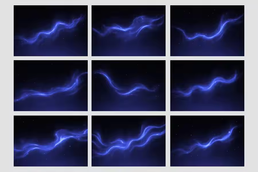 一组宁静的夜空视觉效果,闪耀的蓝色光带在繁星点点的背景上流淌。柔和的光迹营造出梦幻般的天体氛围,非常适合需要平衡神秘与宁静的项目。非常适合用于宇宙或未来主题的海报、品牌宣传、封面和数字设计。
