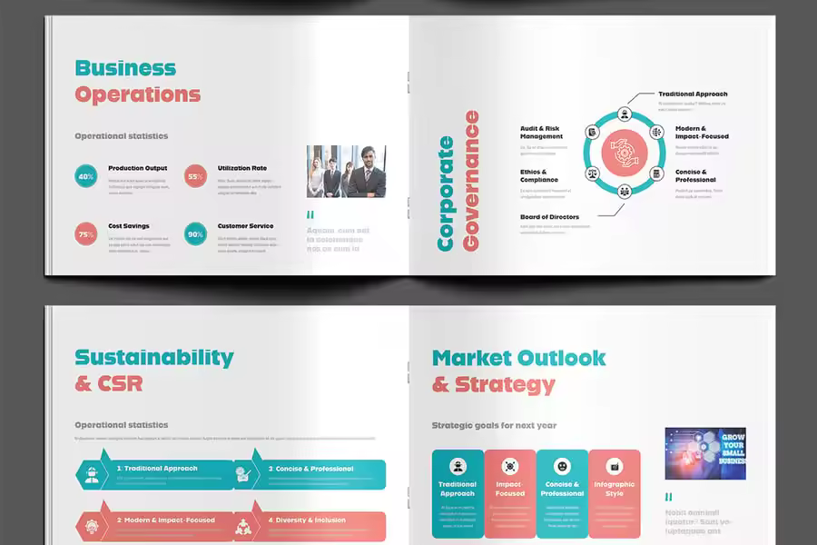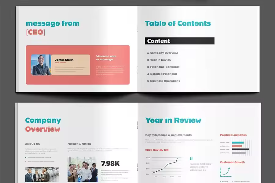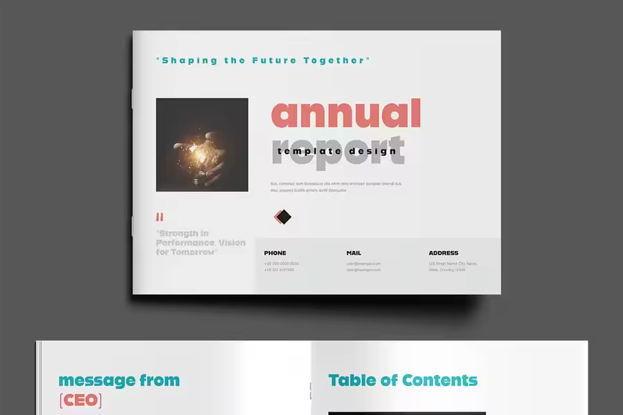 创意商业年度报告模板采用现代且视觉引人入胜的布局,旨在帮助企业以创意的方式呈现财务数据、成就和里程碑。它拥有简洁的网格、醒目的视觉效果和可自定义的版块,兼具专业性与引人注目的设计。此模板非常适合用于印刷版或电子版报告,能够将公司数据转化为引人入胜、易于阅读的叙述。