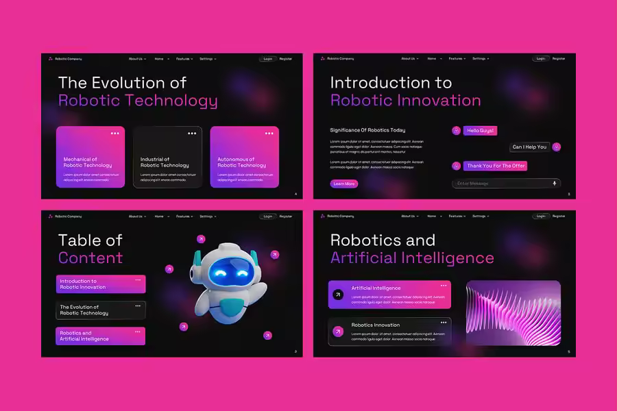 机器人创新 PowerPoint 演示文稿模板是一款现代专业的幻灯片,旨在展示尖端技术、机器人研究、自动化系统和未来创新。该模板非常适合初创公司、科技公司、工程师、研究人员和商务人士,它将流畅的布局与高科技视觉效果相结合,让您的演示文稿更具影响力和吸引力。凭借独特的幻灯片、可自定义的信息图表、图表、设备模型和未来主义的设计元素,您可以轻松展示关于人工智能、机器人、自动化、机器学习和工业技术的想法。每张幻灯片都经过精心设计,清晰地突出您的概念,确保您的观众保持专注并留下深刻印象。