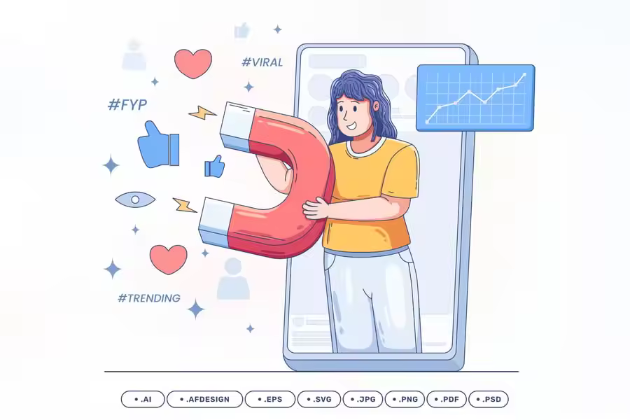 社交媒体参与度和在线增长的插图代表着一位开朗的女人站在智能手机前,手里拿着一块大磁铁,吸引点赞、爱心和评论。