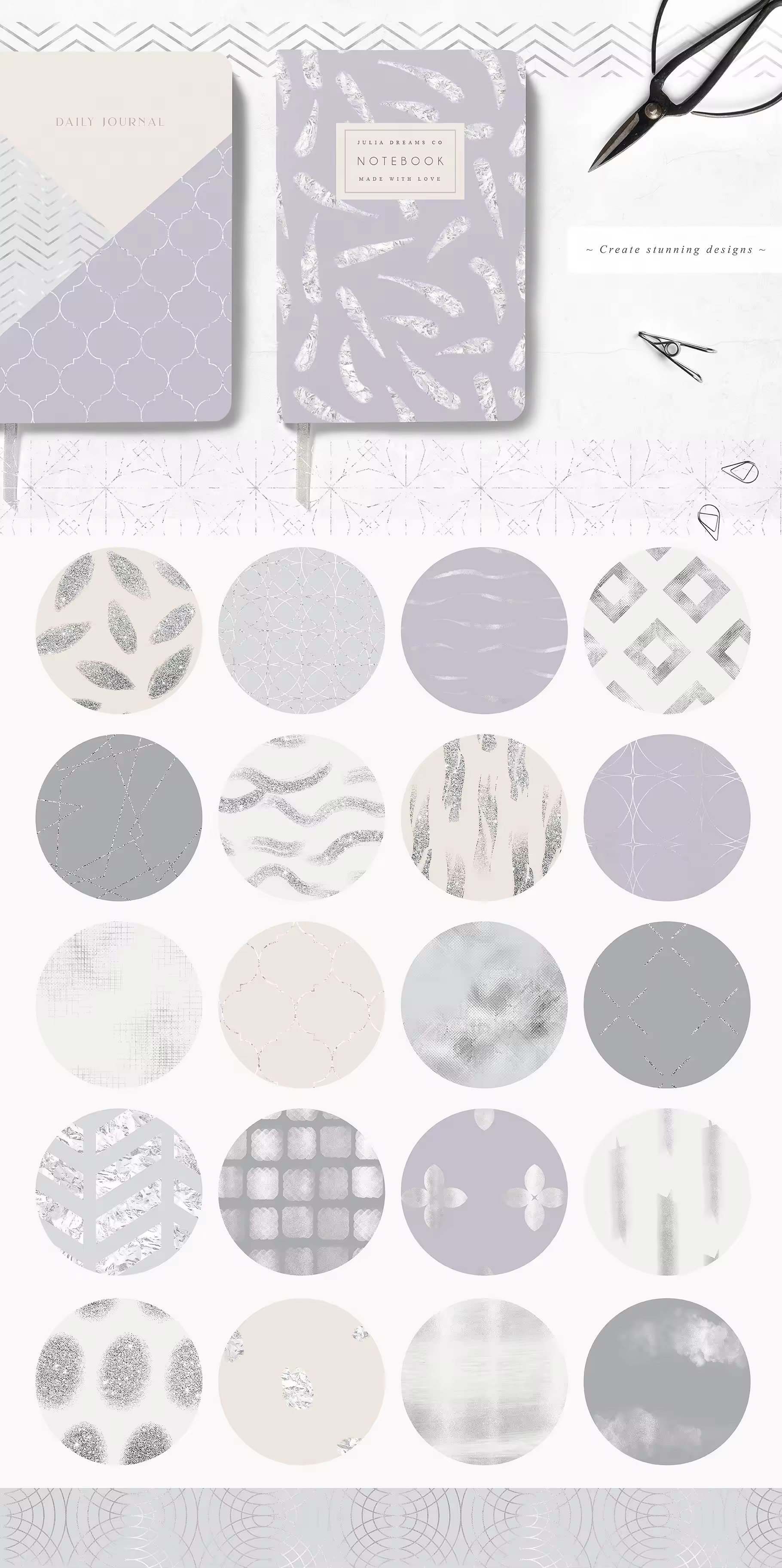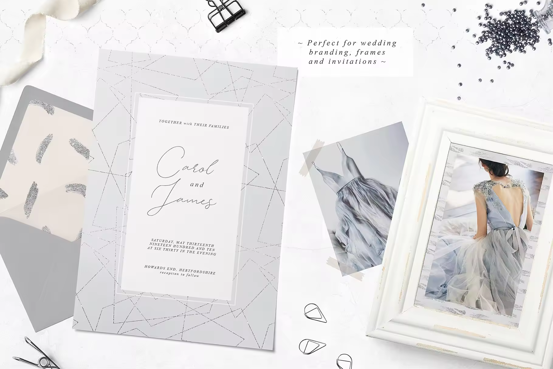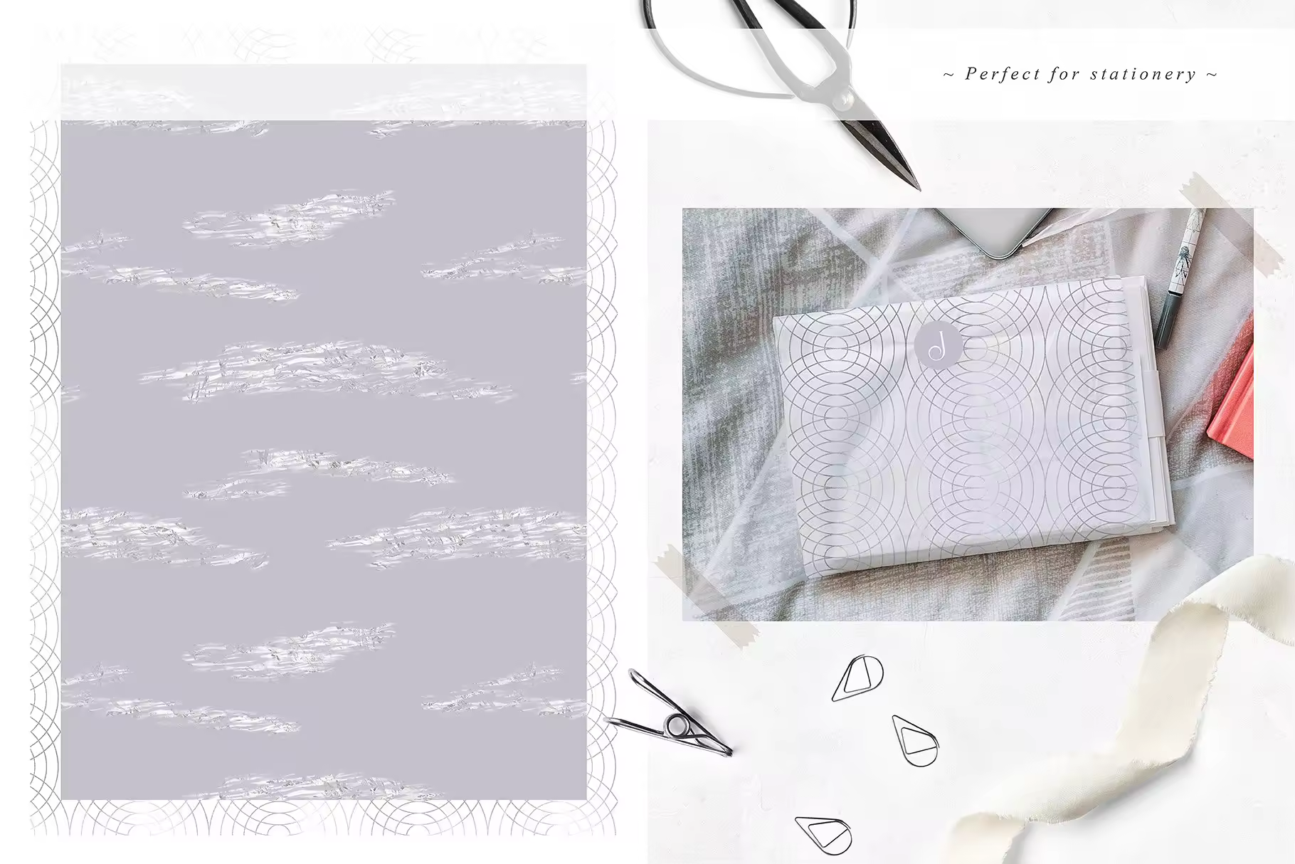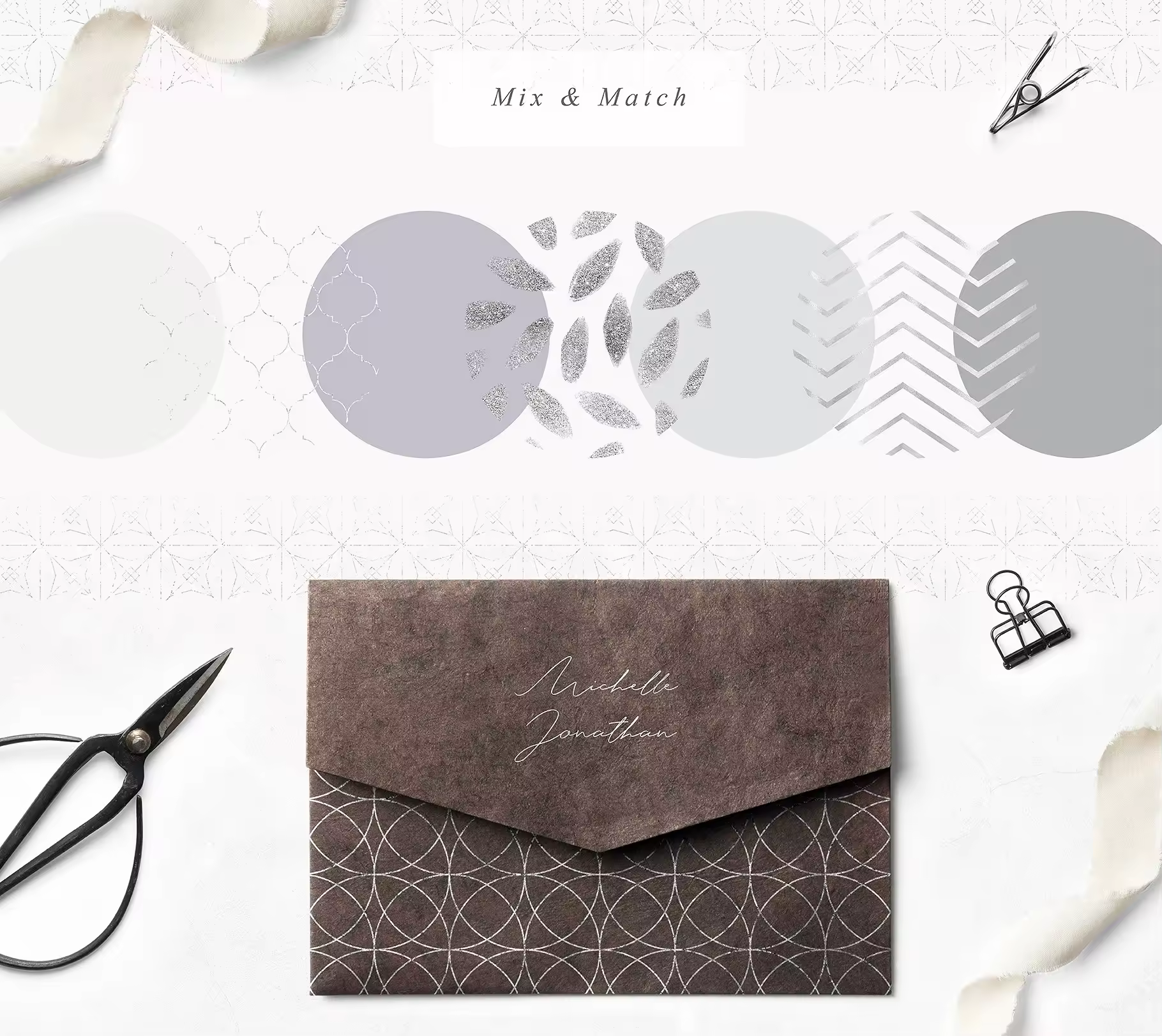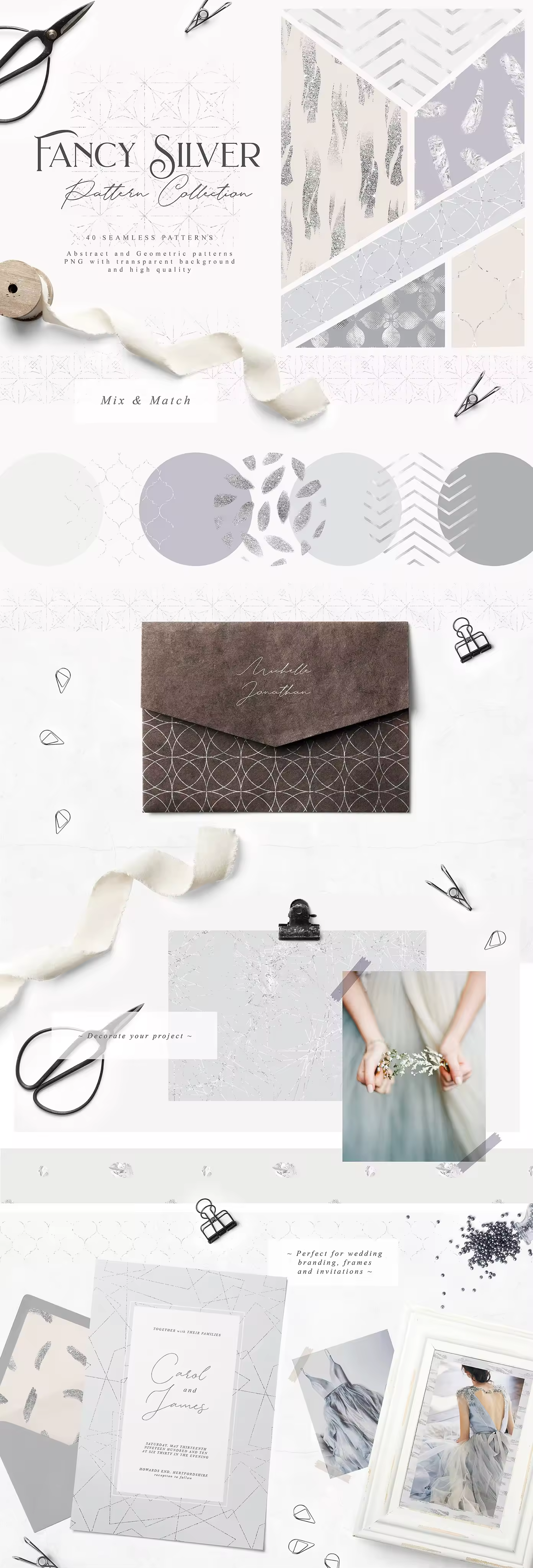 梦幻银色几何图案和抽象线条图案纹理 Fancy Silver Patterns 图案/花样 9.4k+ OHM。 这些纹理是用于创建企业标识或婚礼品牌的理想素材,或者用于装饰您的房间或者制作婚礼请柬,您也可以添加这些美丽的图案来创建一张明信片。